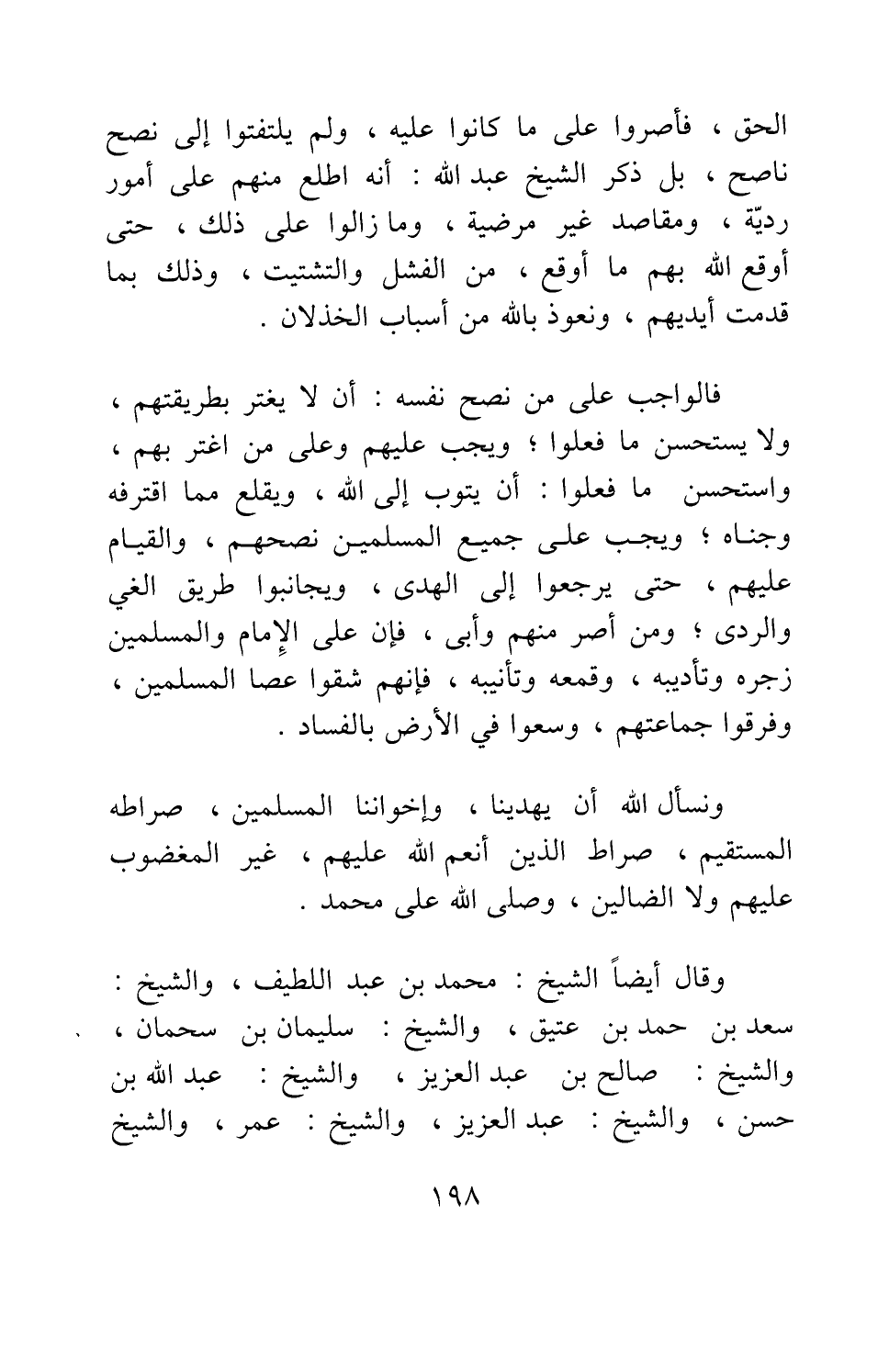 وقال أيضا الشيخ محمد بن عبد اللطيف، والشيخ سعد بن حمد بن عتيق، والشيخ سليمان بن سحمان، والشيخ صالح بن عبد العزيز، والشيخ: عبد الله بن حسن، والشيخ: عبد العزيز، والشيخ: عمر، والشيخ