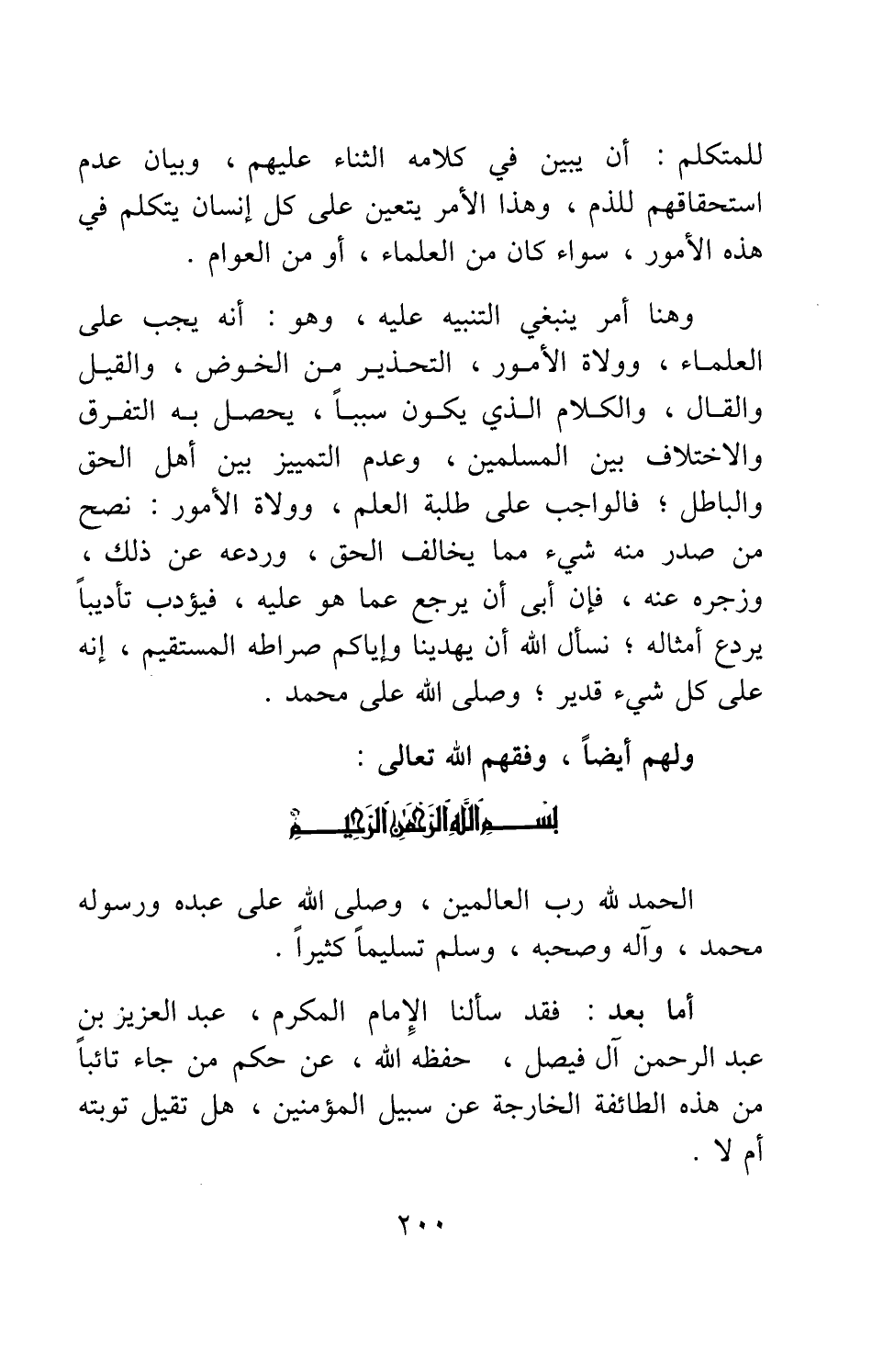 وهنا أمر ينبغي التنبيه عليه، وهو أنه يجب على العلماء، وولاة الأمور، التحذير من الخوض، والقيل والقال، والكلام الذي يكون سببا، يحصل به التفرق والاختلاف بين المسلمين، وعدم التمييز بين أهل الحق والباطل؛ فالواجب على طلبة العلم، وولاة الأمور نصح من صدر منه شيء مما يخالف الحق، وردعه عن ذلك، وزجره عنه، فإن أبى أن يرجع عما هو عليه، فيؤدب تأديبا يردع أمثاله، نسأل الله أن يهدينا وإياكم صراطه المستقيم؛ إنه على كل شيء قدير، وصلى الله على محمد.