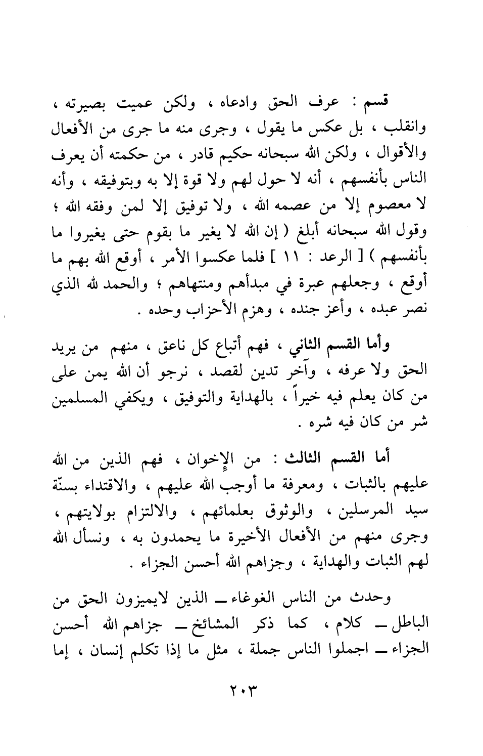 أما القسم الثالث من الإخوان: فهم الذين من الله عليهم بالثبات، ومعرفة ما أوجب الله عليهم، والاقتداء بسنة سيد المرسلين، والوثوق بعلمائهم، والالتزام بولايتهم، وجرى منهم من الأفعال الأخيرة ما يحمدون به، ونسأل الله لهم الثبات والهداية، وجزاهم الله أحسن الجزاء.
