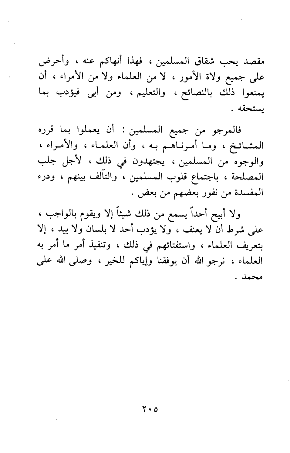 فالمرجو من جميع المسلمين أن يعملوا بما قرره المشايخ، وما أمرناهم به، وأن العلماء، والأمراء، والوجوه من المسلمين، يجتهدون في ذلك، لأجل جلب المصلحة، باجتماع قلوب المسلمين، والتآلف بينهم، ودرء المفسدة من نفور بعضهم من بعض.