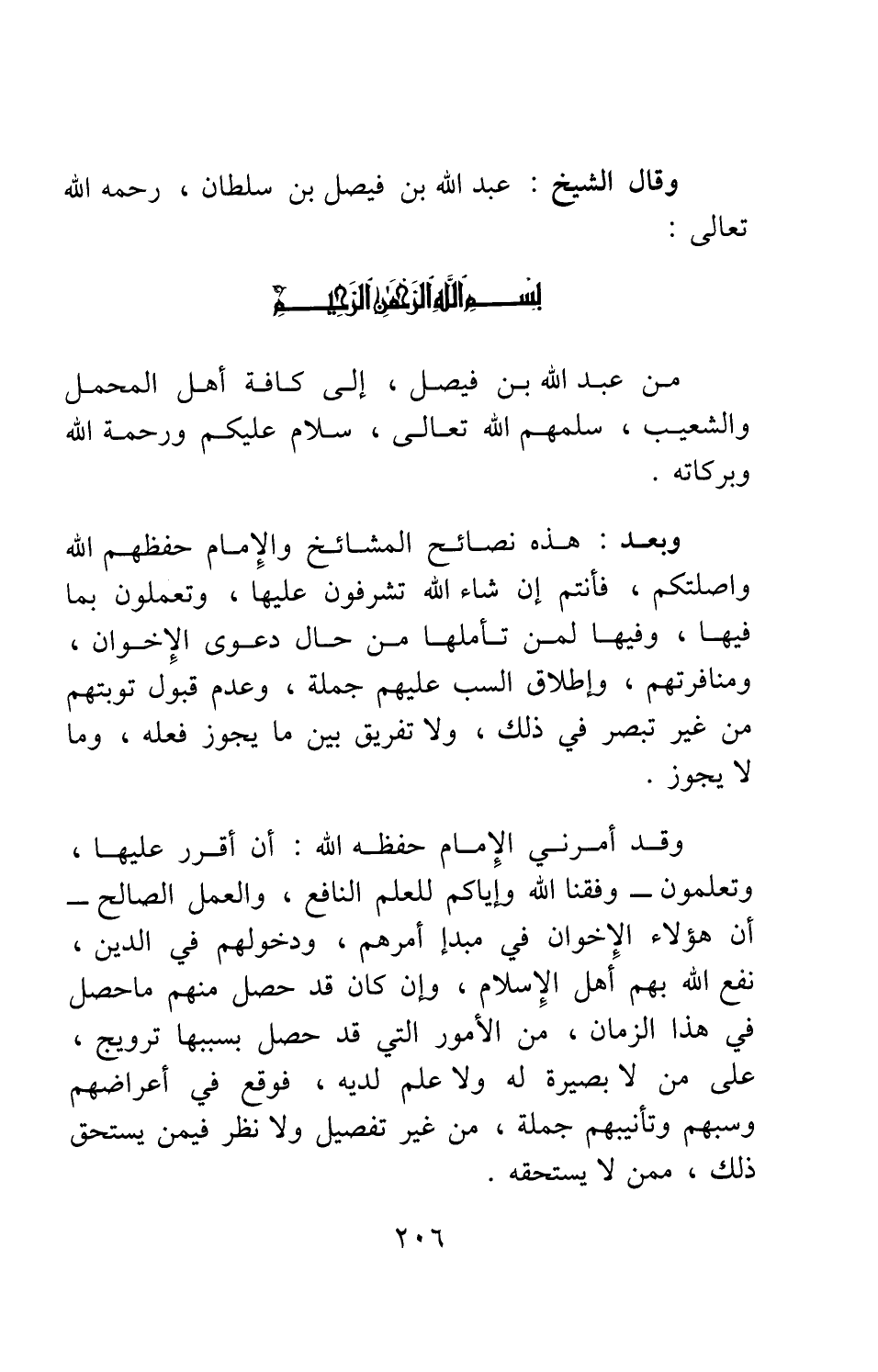 من عبد الله بن فيصل، إلى كافة أهل المحمل والشعيب، سلمهم الله تعالى، سلام عليكم ورحمة الله وبركاته.