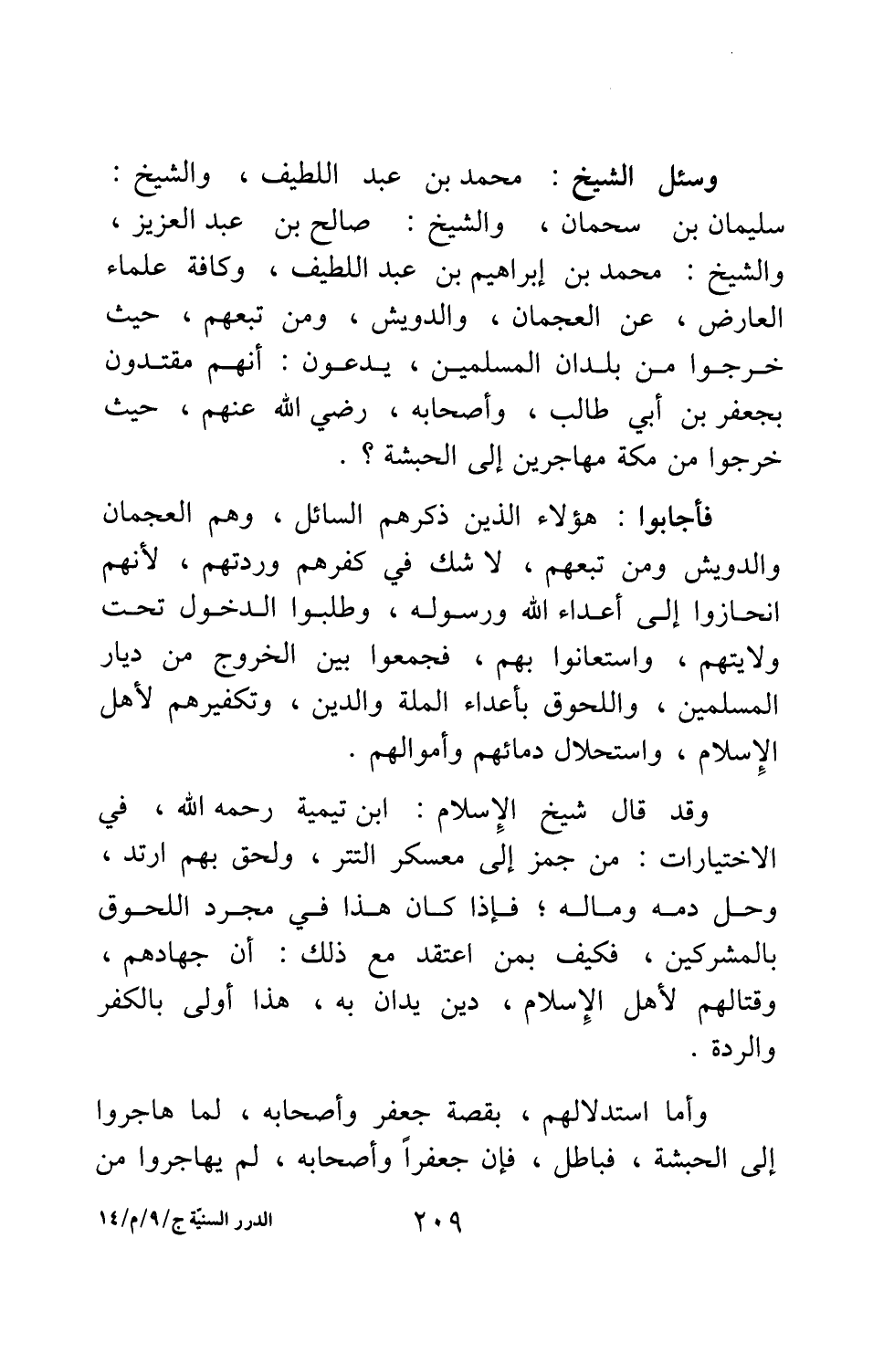 وسئل الشيخ محمد بن عبد اللطيف، والشيخ سليمان بن سحمان، والشيخ: صالح بن عبد العزيز، والشيخ محمد بن إبراهيم بن عبد اللطيف، وكافة علماء العارض، عن العجمان، والدويش، ومن تبعهم، حيث خرجوا من بلدان المسلمين، يدعون: أنهم مقتدون بجعفر بن أبي طالب وأصحابه، رضي الله عنهم، حيث خرجوا من مكة مهاجرين إلى الحبشة؟
