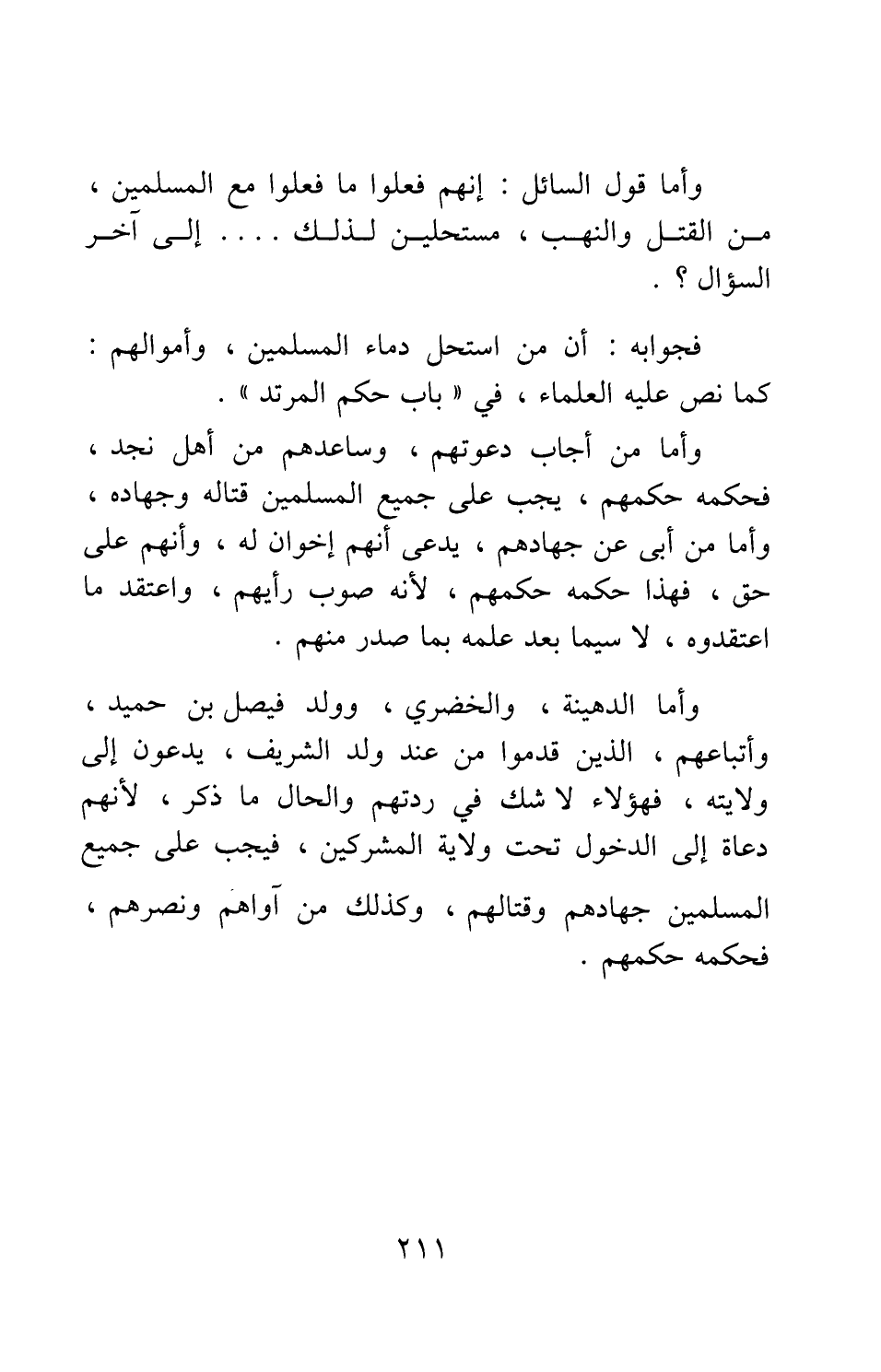 وأما الدهينة، والخضري، وولد فيصل بن حميد، وأتباعهم، الذين قدموا من عند ولد الشريف، يدعون إلى ولايته، فهؤلاء لا شك في ردتهم والحال ما ذكر، لأنهم دعاة إلى الدخول تحت ولاية المشركين، فيجب على جميع المسلمين جهادهم وقتالهم، وكذلك من آواهم ونصرهم، فحكمه حكمهم.