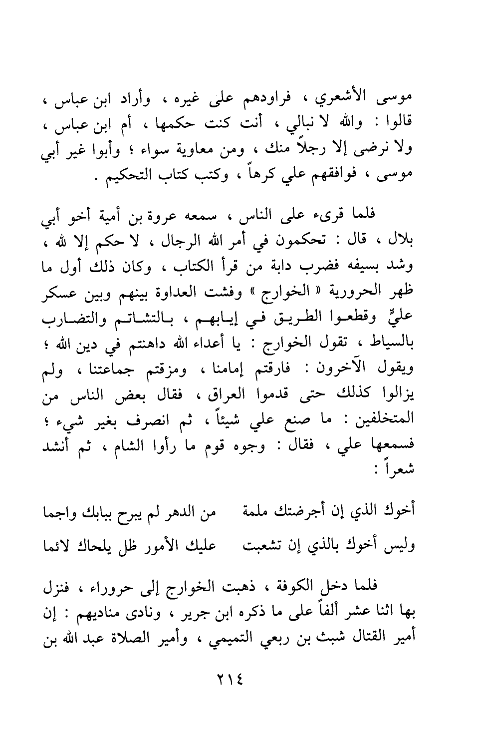 فلما قرئ على الناس، سمعه عروة بن أمية أخو أبي بلال، قال: تحكمون في أمر الله الرجال، لاحكم إلا لله، وشد بسيفه فضرب دابة من قرأ الكتاب، وكان ذلك أول ما ظهر الحرورية "الخوارج" وفشت العداوة بينهم وبين عسكر علي وقطعوا الطريق في إيابهم، بالتشاتم والتضارب بالسياط، تقول الخوارج: يا أعداء الله داهنتم في دين الله؛ ويقول الآخرون: فارقتم إمامنا، ومزقتم جماعتنا ولم يزالوا كذلك حتى قدموا العراق، فقال بعض الناس من المتخلفين: ما صنع علي شيئا، ثم انصرف بغير شيء؛ فسمعها علي، فقال: وجوه قوم ما رأوا الشام، ثم أنشد شعرا: