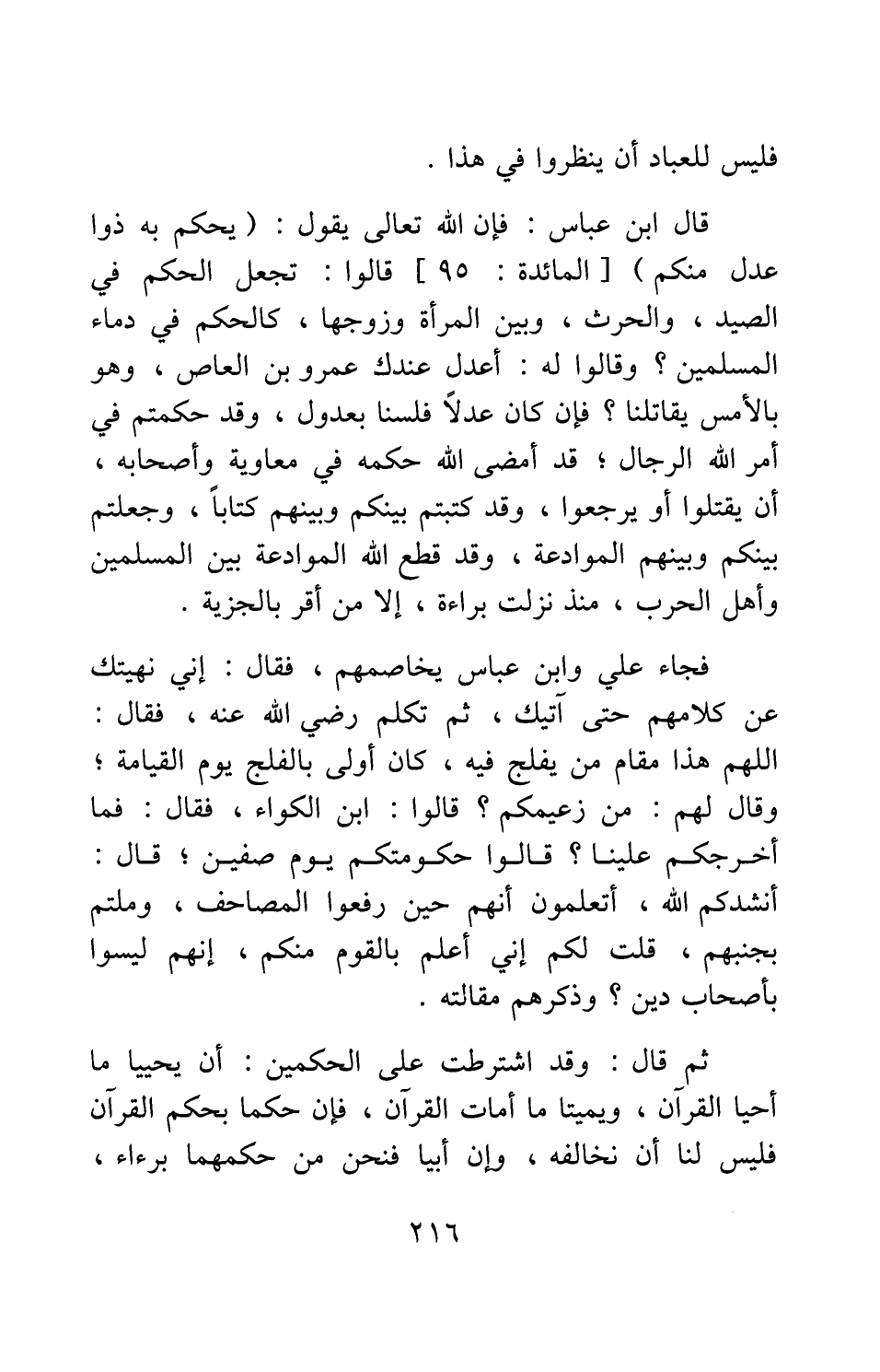 قال ابن عباس: فإن الله تعالى يقول: {يَحْكُمُ بِهِ ذَوَا عَدْلٍ مِنْكُمْ} [سورة المائدة آية: 95] قالوا: تجعل الحكم في الصيد، والحرث، وبين المرأة وزوجها، كالحكم في دماء المسلمين؟ وقالوا له: أعدل عندك عمرو بن العاص، وهو بالأمس يقاتلنا؟ فإن كان عدلا فلسنا بعدول، وقد حكمتم في أمر الله الرجال؛ قد أمضى الله حكمه في معاوية وأصحابه، أن يقتلوا أو يرجعوا، وقد كتبتم بينكم وبينهم كتابا، وجعلتم بينكم وبينهم الموادعة، وقد قطع الله الموادعة بين المسلمين وأهل الحرب، منذ نزلت براءة، إلا من أقر بالجزية.