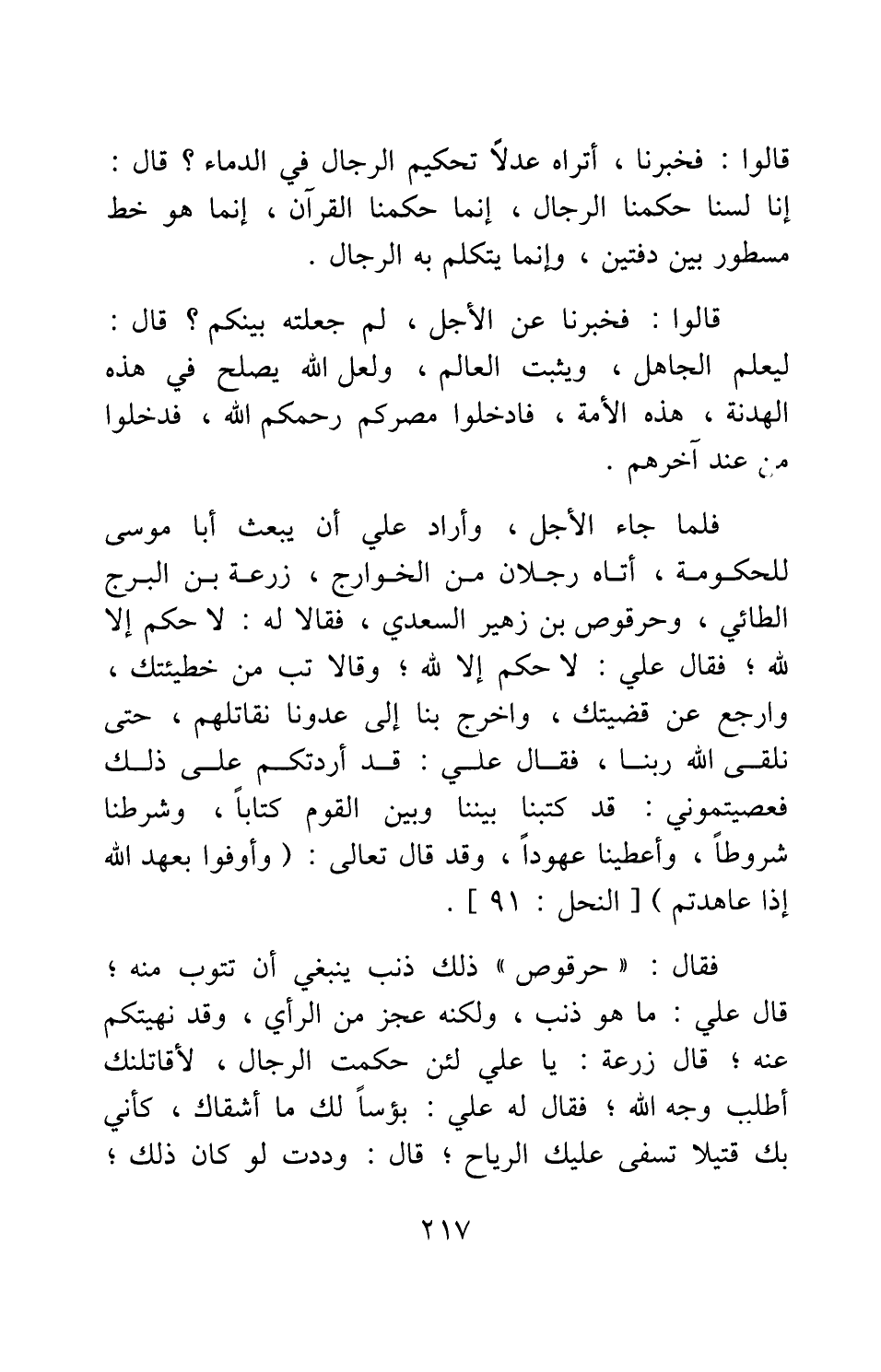 قالوا: فخبرنا، أتراه عدلا تحكيم الرجال في الدماء؟ قال: إنا لسنا حكمنا الرجال، إنما حكمنا القرآن، إنما هو خط مسطور بين دفتين، وإنما يتكلم به الرجال.