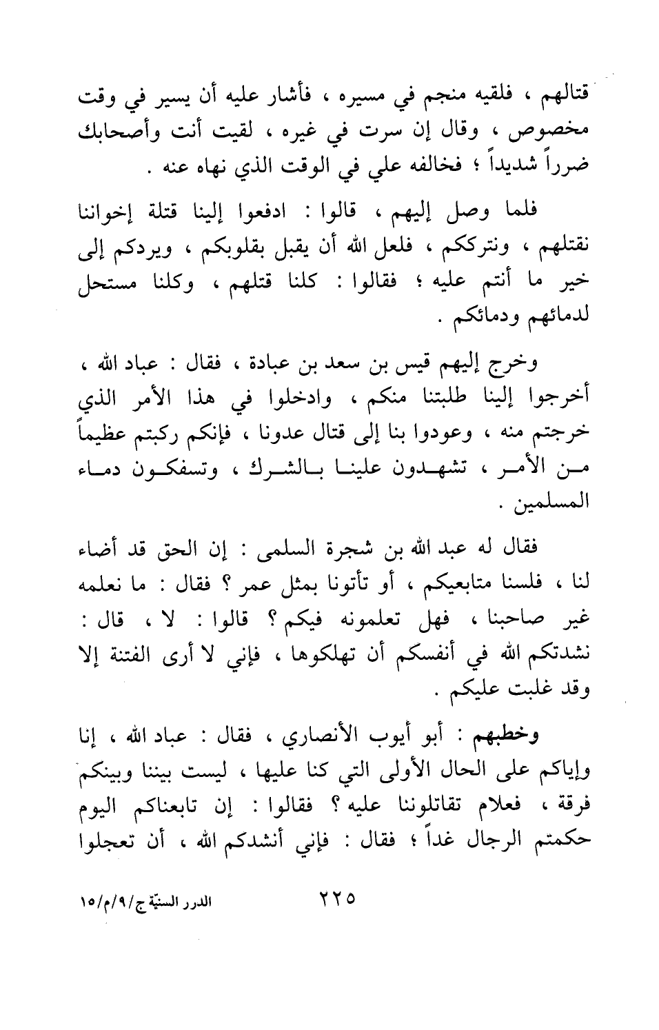 وخرج إليهم قيس بن سعد بن عبادة، فقال: عباد الله، أخرجوا إلينا طلبتنا منكم، وادخلوا في هذا الأمر الذي خرجتم منه، وعودوا بنا إلى قتال عدونا، فإنكم ركبتم عظيما من الأمر، تشهدون علينا بالشرك، وتسفكون دماء المسلمين.