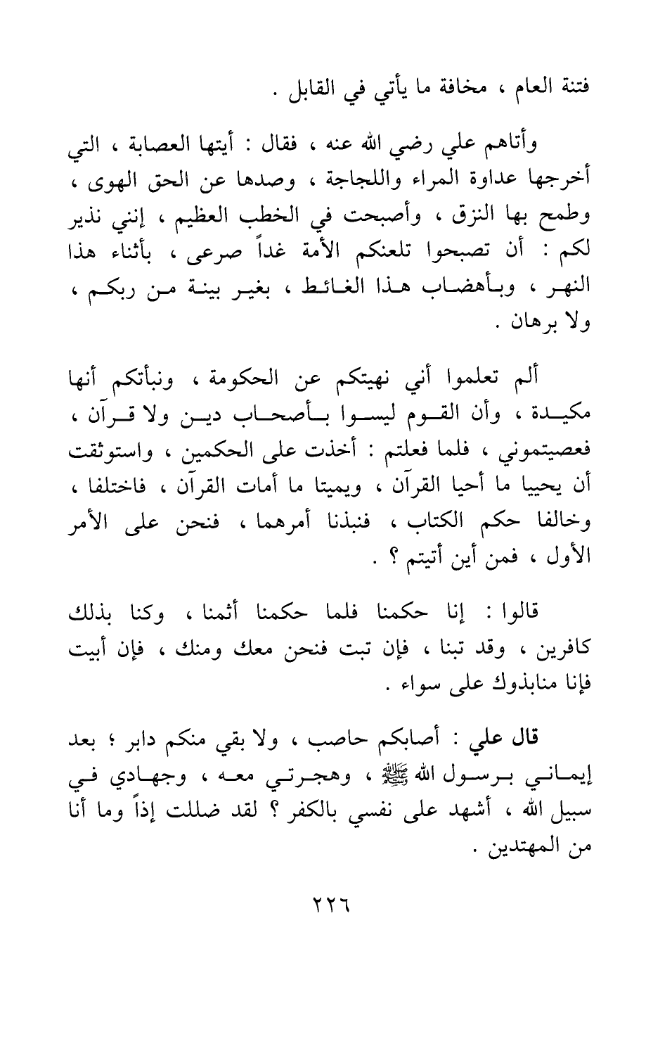 وأتاهم علي رضي الله عنه، فقال: أيتها العصابة، التي أخرجها عداوة المراء واللجاجة، وصدها عن الحق الهوى، وطمع بها النزق، وأصبحت في الخطب العظيم، إنني نذير لكم: أن تصبحوا بلعنكم الأمة غدا صرعى، بأثناء هذا النهر، وبأهضاب هذا الغائط، بغير بينة من ربكم، ولا برهان.