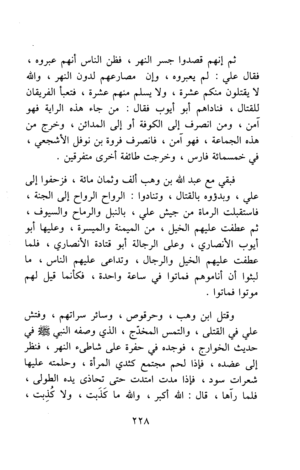 وقتل ابن وهب، وحرقوص، وسائر سراتهم، وفتش علي في القتلى، والتمس المخدج، الذي وصفه البني صلى الله عليه وسلم في حديث الخوارج، فوجده في حفرة على شاطئ النهر، فنظر إلى عضده، فإذا لحم مجتمع كثدي الممرأة، وحلته عليها شعرات سود، فإذا مدت امتدت حتى تحاذى يده الطولى، فلما رآها، قال: الله أكبر، والله ما كذبت، ولا كذبت،
