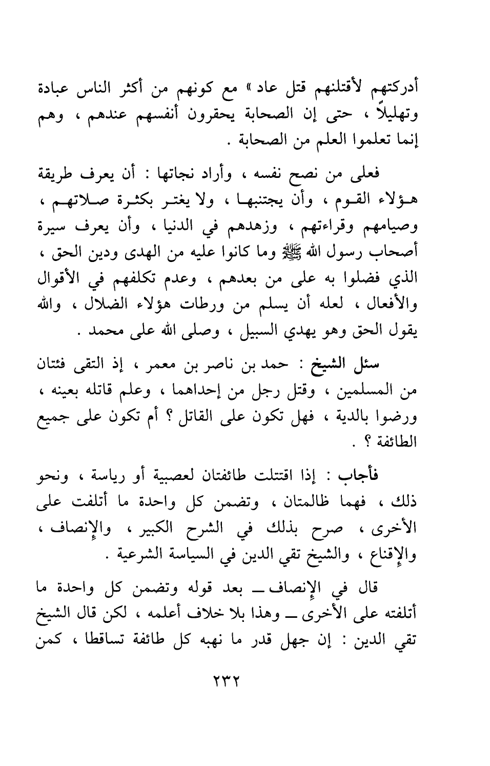 فأجاب: إذا اقتتلت طائفتان لعصبية أو رياسة، ونحو ذلك، فهما ظالمتان، وتضمن كل واحدة ما أتلفت على الأخرى، صرح بذلك في "الشرح الكبير"، و"الإنصاف"، و"الإقناع"، والشيخ تقي الدين في السياسة الشرعية.