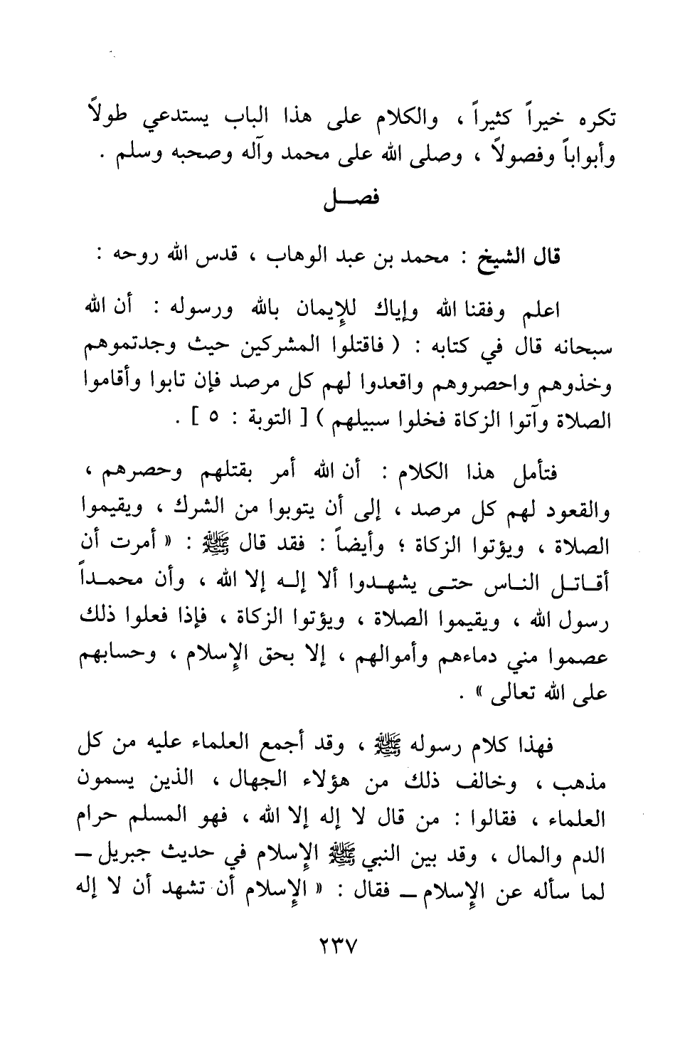 فصل قال الشيخ: محمد بن عبد الوهاب، قدس الله روحه: