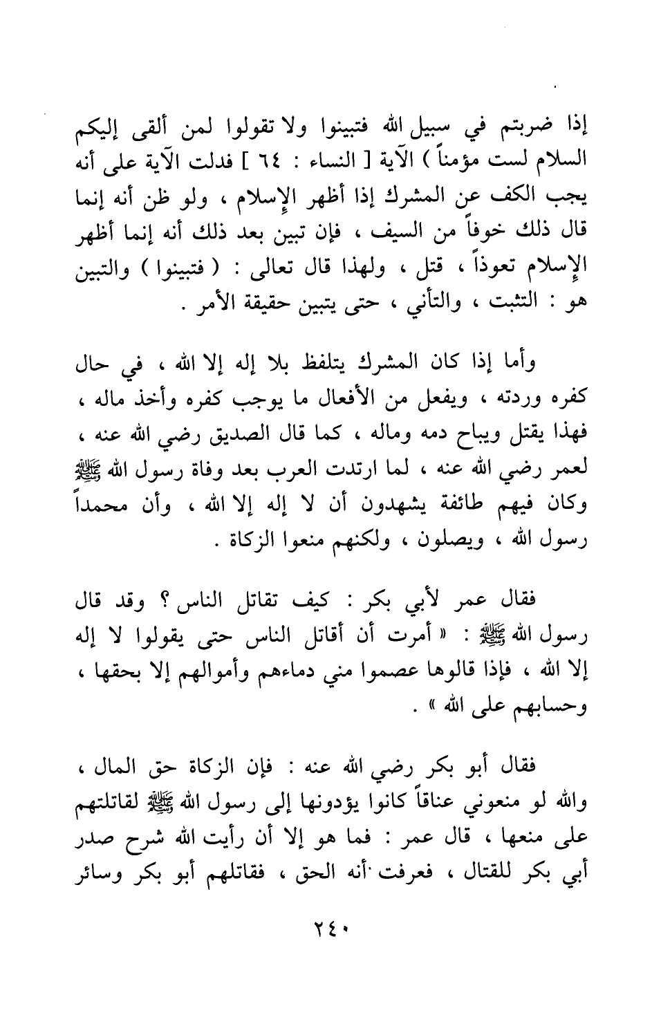 إِذَا ضَرَبْتُمْ فِي سَبِيلِ اللَّهِ فَتَبَيَّنُوا وَلا تَقُولُوا لِمَنْ أَلْقَى إِلَيْكُمُ السَّلامَ لَسْتَ مُؤْمِناً} [سورة النساء آية: 94] الآية؛ فدلت الآية على أنه يجب الكف عن المشرك إذا أظهر الإسلام، ولو ظن أنه إنما قال ذلك خوفا من السيف؛ فإن تبين بعد ذلك أنه إنما أظهر الإسلام تعوذا، قتل، ولهذا قال تعالى: {فَتَبَيَّنُوا} والتبين هو: التثبت، والتأني، حتى يتبين حقيقة الأمر.