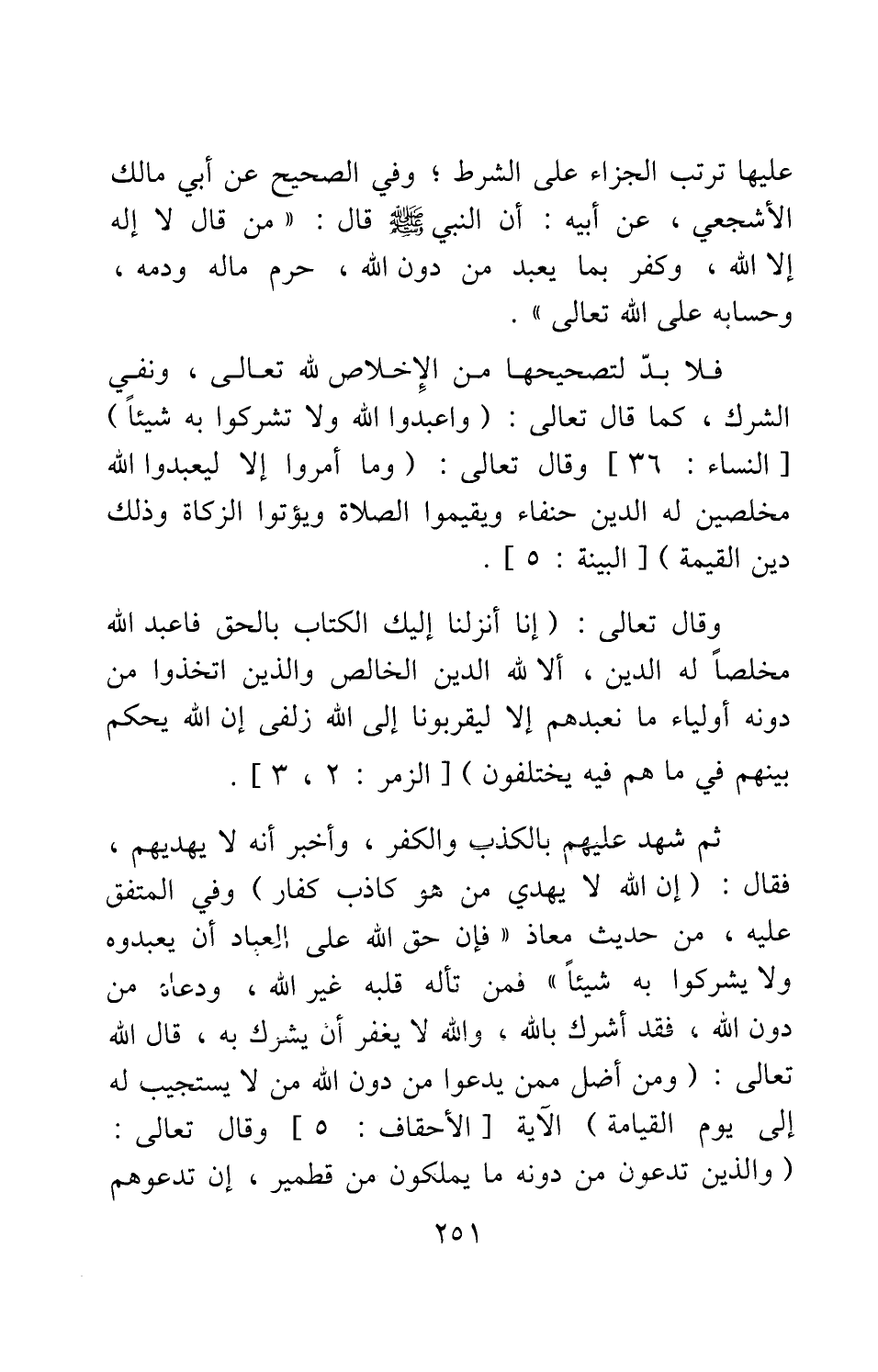 ثم شهد عليهم بالكذب والكفر، وأخبر أنه لا يهديهم، فقال: {إِنَّ اللَّهَ لا يَهْدِي مَنْ هُوَ كَاذِبٌ كَفَّارٌ} [سورة الزمر آية: 3] وفي المتفق عليه، من حديث معاذ " فإن حق الله على العباد أن يعبدوه ولا يشركوا به شيئا " 2 فمن تأله قلبه غير الله، ودعاه من دون الله، فقد أشرك بالله، والله لا يغفر أن يشرك به، قال الله تعالى: {وَمَنْ أَضَلُّ مِمَّنْ يَدْعُو مِنْ دُونِ اللَّهِ مَنْ لا يَسْتَجِيبُ لَهُ إِلَى يَوْمِ الْقِيَامَةِ} [سورة الأحقاف آية: 5] الآية وقال تعالى: {وَالَّذِينَ تَدْعُونَ مِنْ دُونِهِ مَا يَمْلِكُونَ مِنْ قِطْمِيرٍ ِإنْ تَدْعُوهُمْ