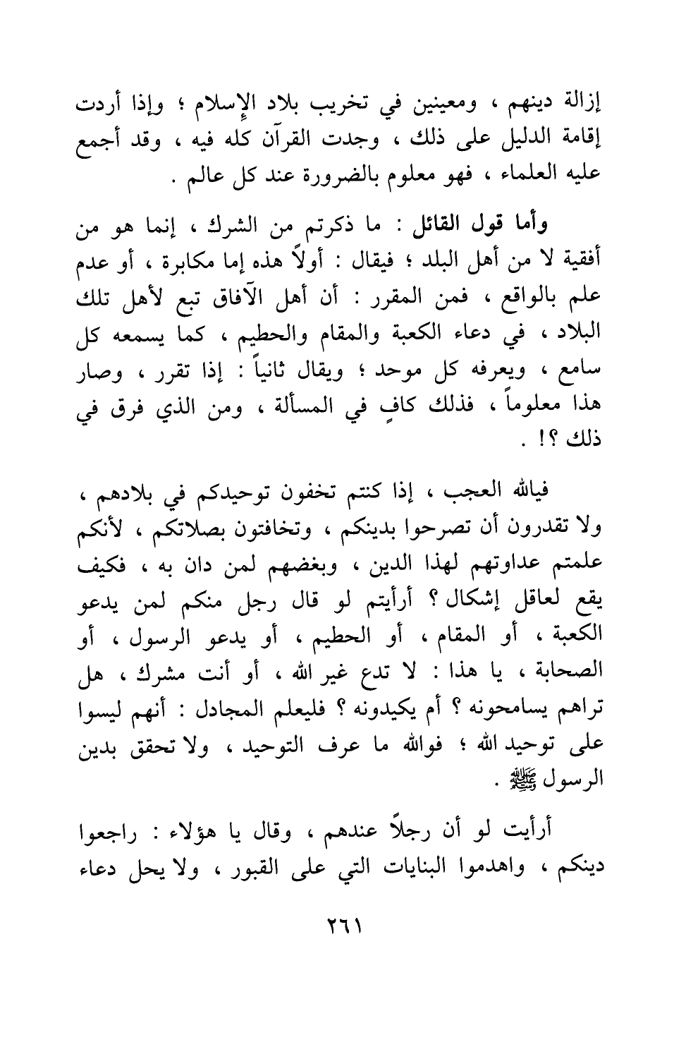 فيالله العجب، إذا كنتم تخفون توحيدكم في بلادهم، ولا تقدرون أن تصرحوا بدينكم، وتخافتون بصلاتكم، لأنكم علمتم عداوتهم لهذا الدين، وبغضهم لمن دان به، فكيف يقع لعاقل إشكال؟ أرأيتم لو قال رجل منكم لمن يدعو الكعبة، أو المقام، أو الحطيم، أو يدعو الرسول، أو الصحابة: يا هذا لا تدع غير الله! أو أنت مشرك، هل تراهم يسامحونه؟ أم يكيدونه؟ فليعلم المجادل أنهم ليسوا على توحيد الله; فوالله ما عرف التوحيد، ولا تحقق بدين الرسول صلى الله عليه وسلم.