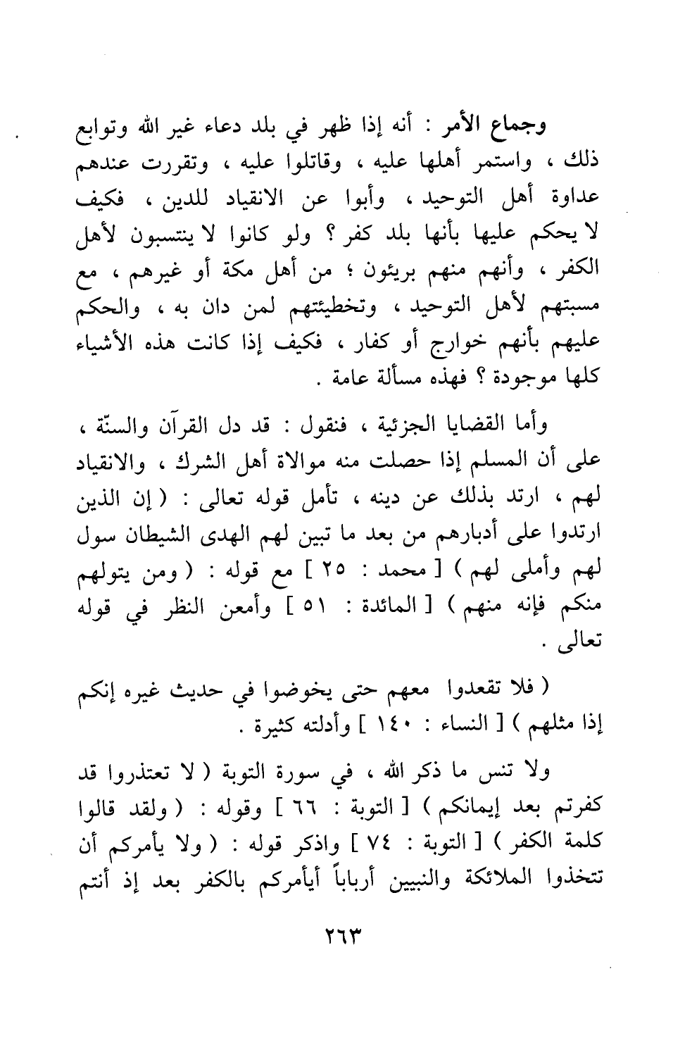 وجماع الأمر: أنه إذا ظهر في بلد دعاء غير الله وتوابع ذلك، واستمر أهلها عليه، وقاتلوا عليه، وتقررت عندهم عداوة أهل التوحيد، وأبوا عن الانقياد للدين، فكيف لا يحكم عليها بأنها بلد كفر؟ ولو كانوا لا ينتسبون لأهل الكفر، وأنهم منهم بريئون; من أهل مكة أو غيرهم، مع مسبتهم لأهل التوحيد، وتخطيئتهم لمن دان به، والحكم عليهم بأنهم خوارج أو كفار، فكيف إذا كانت هذه الأشياء كلها موجودة؟ فهذه مسألة عامة.
