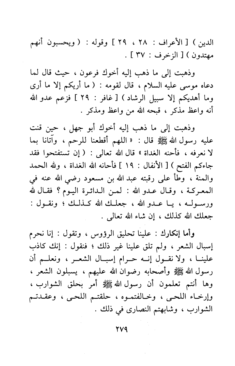 وأما إنكارك: علينا تحليق الرؤوس، وتقول: إنا نحرم إسبال الشعر، ولم تلق علينا غير ذلك; فنقول: إنك كاذب علينا، ولا نقول إنه حرام إسبال الشعر، ونعلم أن رسول الله صلى الله عليه وسلم وأصحابه رضوان الله عليهم، يسبلون الشعر؛ وها أنتم تعلمون أن رسول الله صلى الله عليه وسلم أمر بحلق الشوارب، وإرخاء اللحى، وخالفتموه، حلقتم اللحى، وعقدتم الشوارب، وشابهتم النصارى في ذلك.