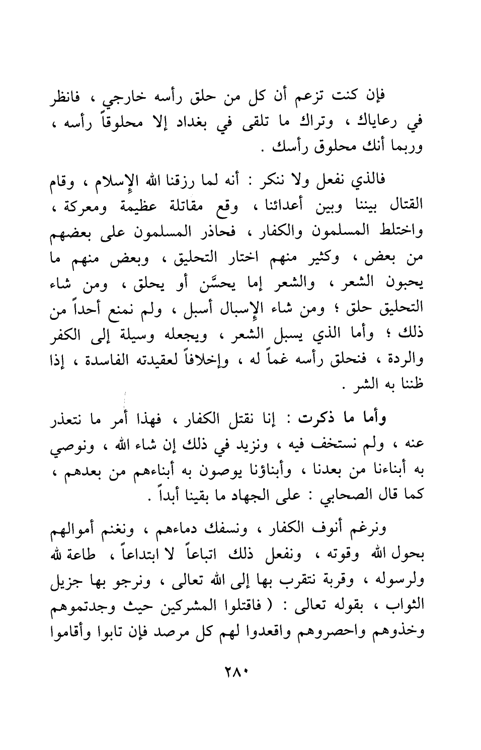 فإن كنت تزعم أن كل من حلق رأسه خارجي، فانظر في رعاياك، وتراك ما تلقى في بغداد إلا محلوقا رأسه، وربما أنك محلوق رأسك.