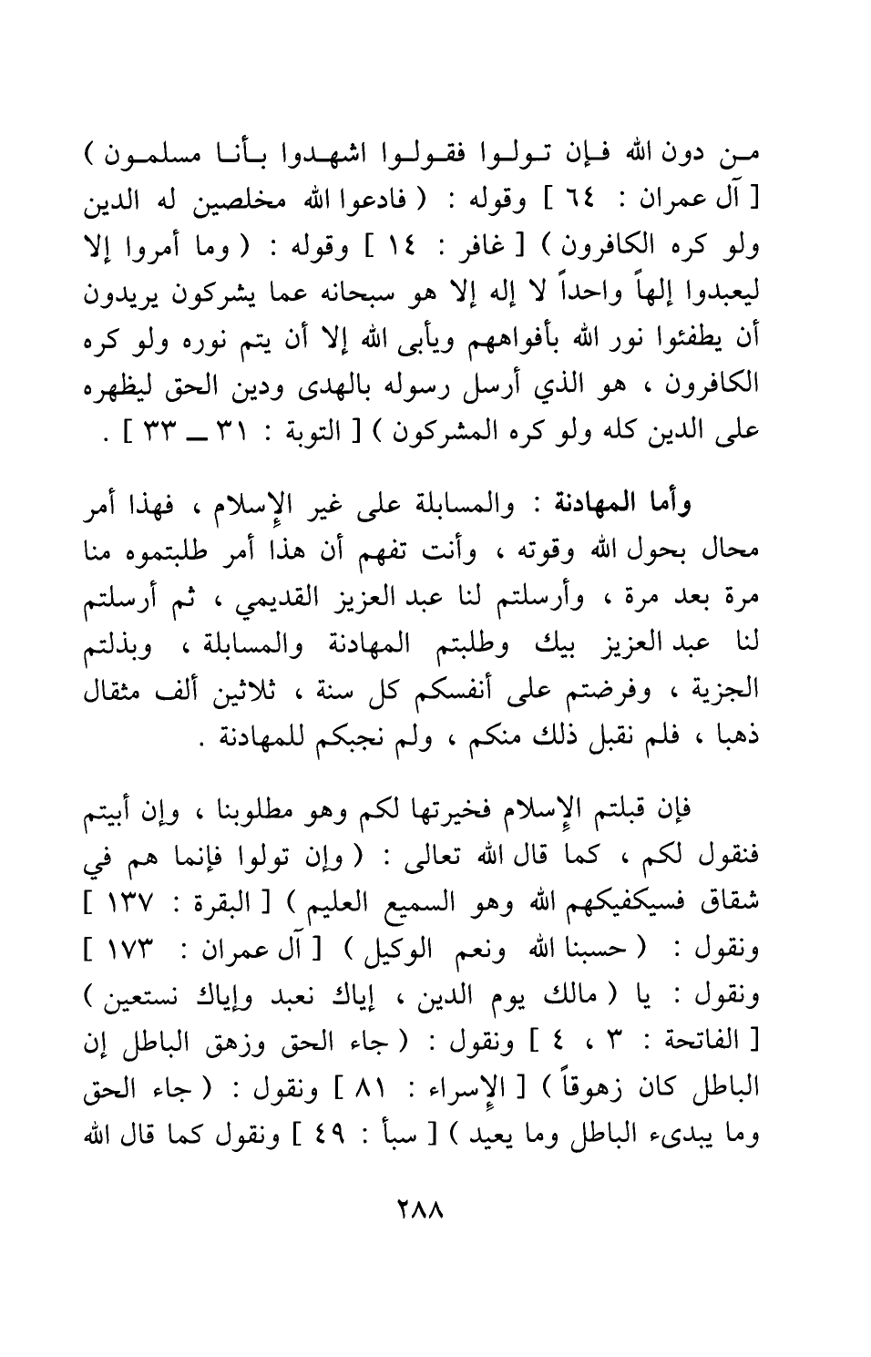 وأما المهادنة: والمسابلة على غير الإسلام، فهذا أمر محال بحول الله وقوته، وأنت تفهم أن هذا أمر طلبتموه منا مرة بعد مرة، وأرسلتم لنا عبد العزيز القديمي، ثم أرسلتم لنا عبد العزيز بيك وطلبتم المهادنة والمسابلة، وبذلتم الجزية، وفرضتم على أنفسكم كل سنة، ثلاثين ألف مثقال ذهبا، فلم نقبل ذلك منكم، ولم نجبكم للمهادنة. فإن قبلتم الإسلام فخيرتها لكم وهو مطلوبنا، وإن أبيتم فنقول لكم، كما قال الله تعالى: {وَإِنْ تَوَلَّوْا فَإِنَّمَا هُمْ فِي شِقَاقٍ فَسَيَكْفِيكَهُمُ اللَّهُ وَهُوَ السَّمِيعُ الْعَلِيمُ} [سورة البقرة آية: 137] ونقول: {حَسْبُنَا اللَّهُ وَنِعْمَ الْوَكِيلُ} [سورة آل عمران آية: 173] ونقول: يا {مَالِكِ يَوْمِ الدِّينِ إِيَّاكَ نَعْبُدُ وَإِيَّاكَ نَسْتَعِينُ} [سورة الفاتحة آية: 3] ونقول: {جَاءَ الْحَقُّ وَزَهَقَ الْبَاطِلُ إِنَّ الْبَاطِلَ كَانَ زَهُوقاً} [سورة الإسراء آية: 81] ونقول: {قُلْ جَاءَ الْحَقُّ وَمَا يُبْدِئُ الْبَاطِلُ وَمَا يُعِيدُ} [سورة سبأ آية: 49] ونقول كما قال الله