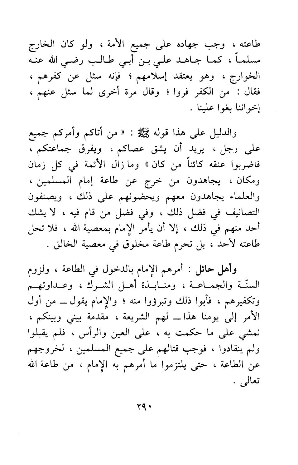والدليل على هذا قوله صلى الله عليه وسلم " من أتاكم وأمركم جميع على رجل، يريد أن يشق عصاكم، ويفرق جماعتكم، فاضربوا عنقه كائنا من كان " 1. وما زال الأئمة في كل زمان ومكان، يجاهدون من خرج عن طاعة إمام المسلمين، والعلماء يجاهدون معهم ويحضونهم على ذلك، ويصنفون التصانيف في فضل ذلك، وفي فضل من قام فيه، لا يشك أحد منهم في ذلك، إلا أن يأمر الإمام بمعصية الله، فلا تحل طاعته لأحد، بل تحرم طاعة مخلوق في معصية الخالق.