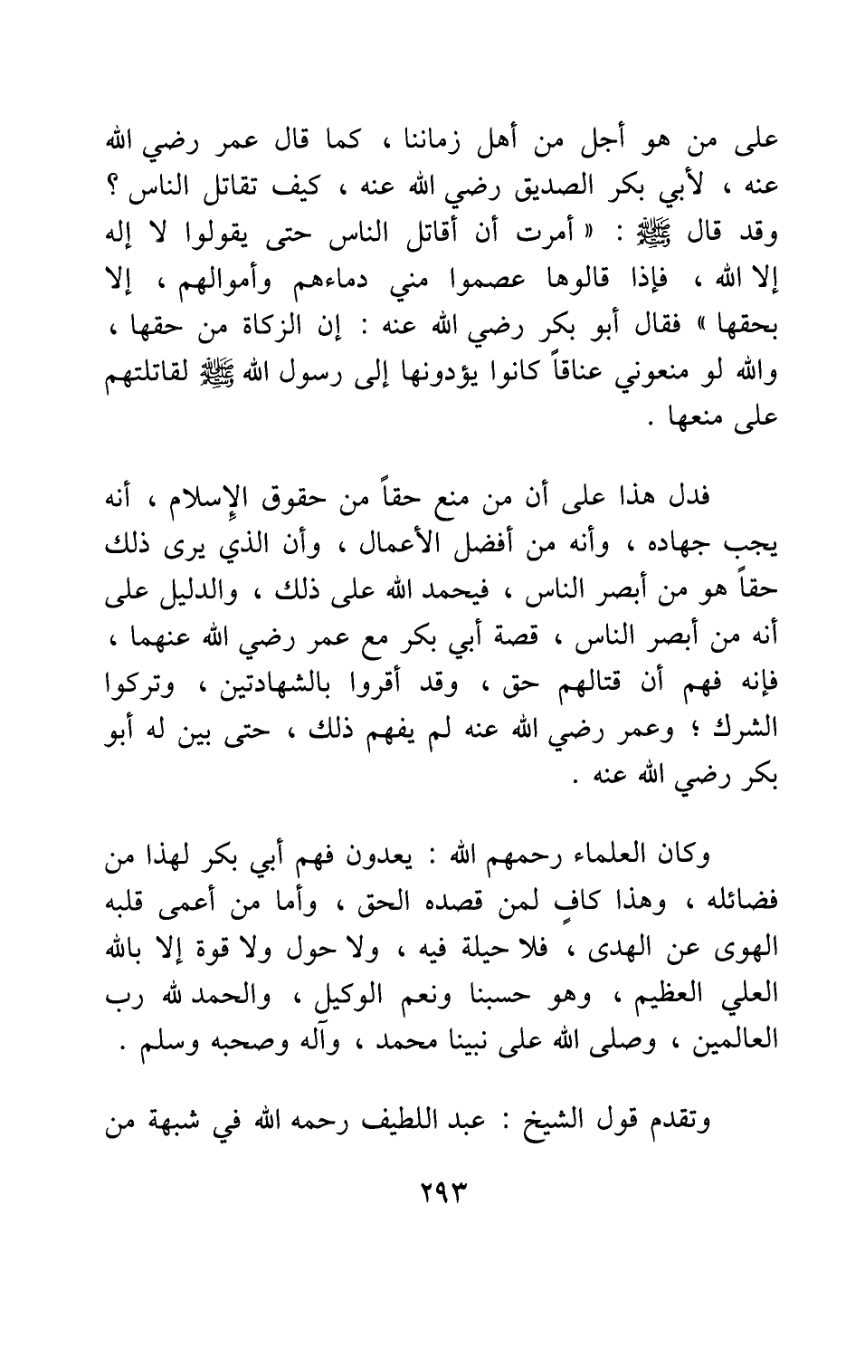 على من هو أجل من أهل زماننا، كما قال عمر رضي الله عنه لأبي بكر الصديق رضي الله عنه: " كيف تقاتل الناس؟ وقد قال صلى الله عليه وسلم أمرت أن أقاتل الناس حتى يقولوا لا إله إلا الله، فإذا قالوها عصموا مني دماءهم وأموالهم، إلا بحقها فقال أبو بكر رضي الله عنه إن الزكاة من حقها، والله لو منعوني عناقا كانوا يؤدونها إلى رسول الله صلى الله عليه وسلم، لقاتلتهم على منعها " 1.