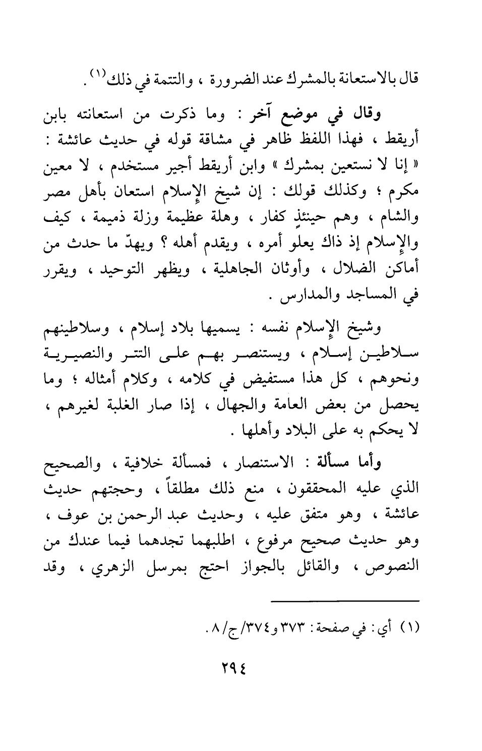 وقال في موضع آخر: وما ذكرت من استعانته بابن أريقط، فهذا اللفظ ظاهر في مشاقة قوله في حديث عائشة: " إنا لا نستعين بمشرك " 2 وابن أريقط أجير مستخدم، لا معين مكرم; وكذلك قولك: إن شيخ الإسلام استعان بأهل مصر والشام، وهم حينئذ كفار، وهلة عظيمة وزلة ذميمة، كيف والإسلام إذ ذاك يعلو أمره، ويقدم أهله؟ ويهدّ ما حدث من أماكن الضلال، وأوثان الجاهلية، ويظهر التوحيد، ويقرر في المساجد والمدارس؟