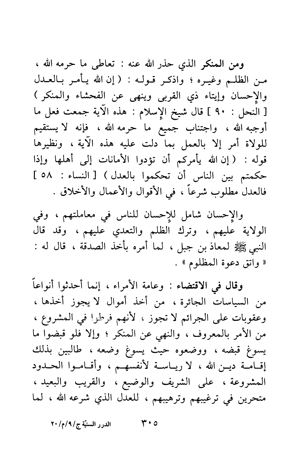 ومن المنكر الذي حذر الله عنه: تعاطي ما حرمه الله، من الظلم وغيره واذكر قوله: {إِنَّ اللَّهَ يَأْمُرُ بِالْعَدْلِ وَالأِحْسَانِ وَإِيتَاءِ ذِي الْقُرْبَى وَيَنْهَى عَنِ الْفَحْشَاءِ وَالْمُنْكَرِ} [سورة النحل آية: 90] قال شيخ الإسلام: هذه الآية جمعت فعل ما أوجبه الله، واجتناب جميع ما حرمه الله، فإنه لا يستقيم للولاة أمر إلا بالعمل بما دلت عليه هذه الآية، ونظيرها قوله: {إِنَّ اللَّهَ يَأْمُرُكُمْ أَنْ تُؤَدُّوا الْأَمَانَاتِ إِلَى أَهْلِهَا وَإِذَا حَكَمْتُمْ بَيْنَ النَّاسِ أَنْ تَحْكُمُوا بِالْعَدْلِ} [سورة النساء آية: 58] فالعدل مطلوب شرعا، في الأقوال والأعمال والأخلاق.