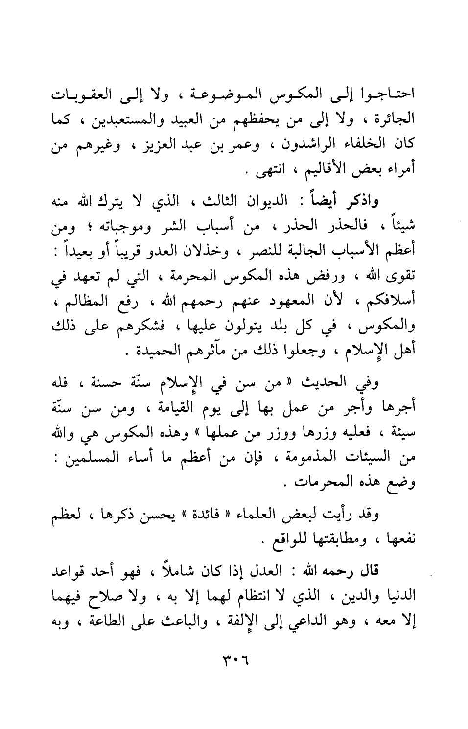 واذكر أيضا: الديوان الثالث، الذي لا يترك الله منه شيئا، فالحذر الحذر، من أسباب الشر وموجباته! ومن أعظم الأسباب الجالبة للنصر، وخذلان العدو قريبا أو بعيدا: تقوى الله، ورفض هذه المكوس المحرمة، التي لم تعهد في أسلافكم، لأن المعهود عنهم رحمهم الله، رفع المظالم، والمكوس، في كل بلد يتولون عليها، فشكرهم على ذلك أهل الإسلام، وجعلوا ذلك من مآثرهم الحميدة.