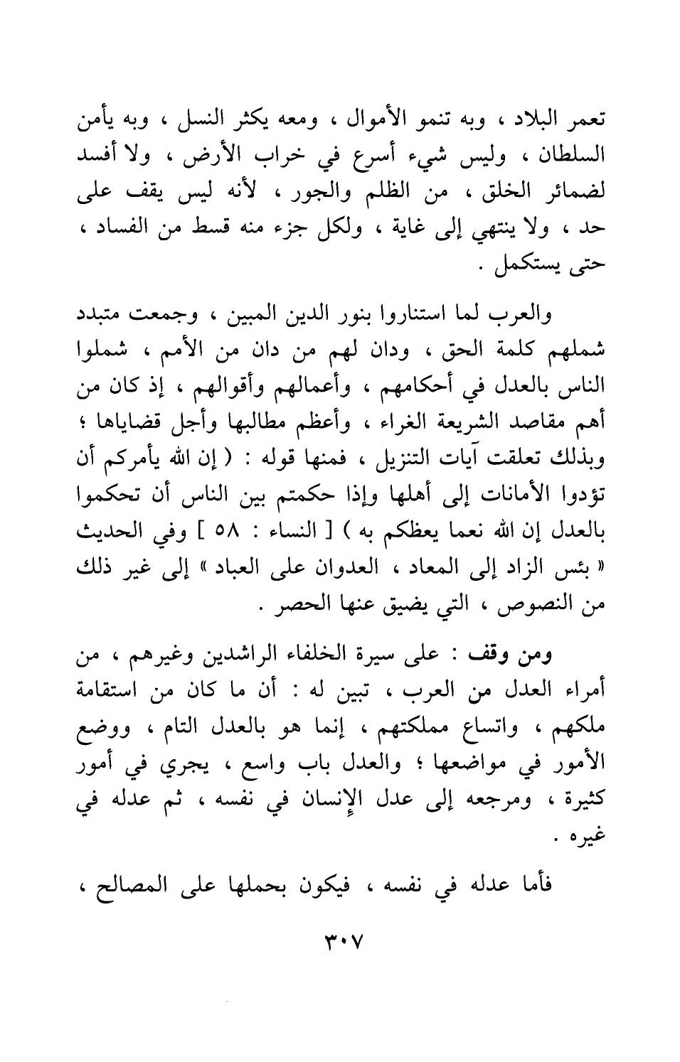 ومن وقف على سيرة الخلفاء الراشدين وغيرهم، من أمراء العدل من العرب تبين له: أن ما كان من استقامة ملكهم، واتساع مملكتهم، إنما هو بالعدل التام، ووضع الأمور في مواضعها والعدل باب واسع، يجري في أمور كثيرة، ومرجعه إلى عدل الإنسان في نفسه، ثم عدله في غيره.