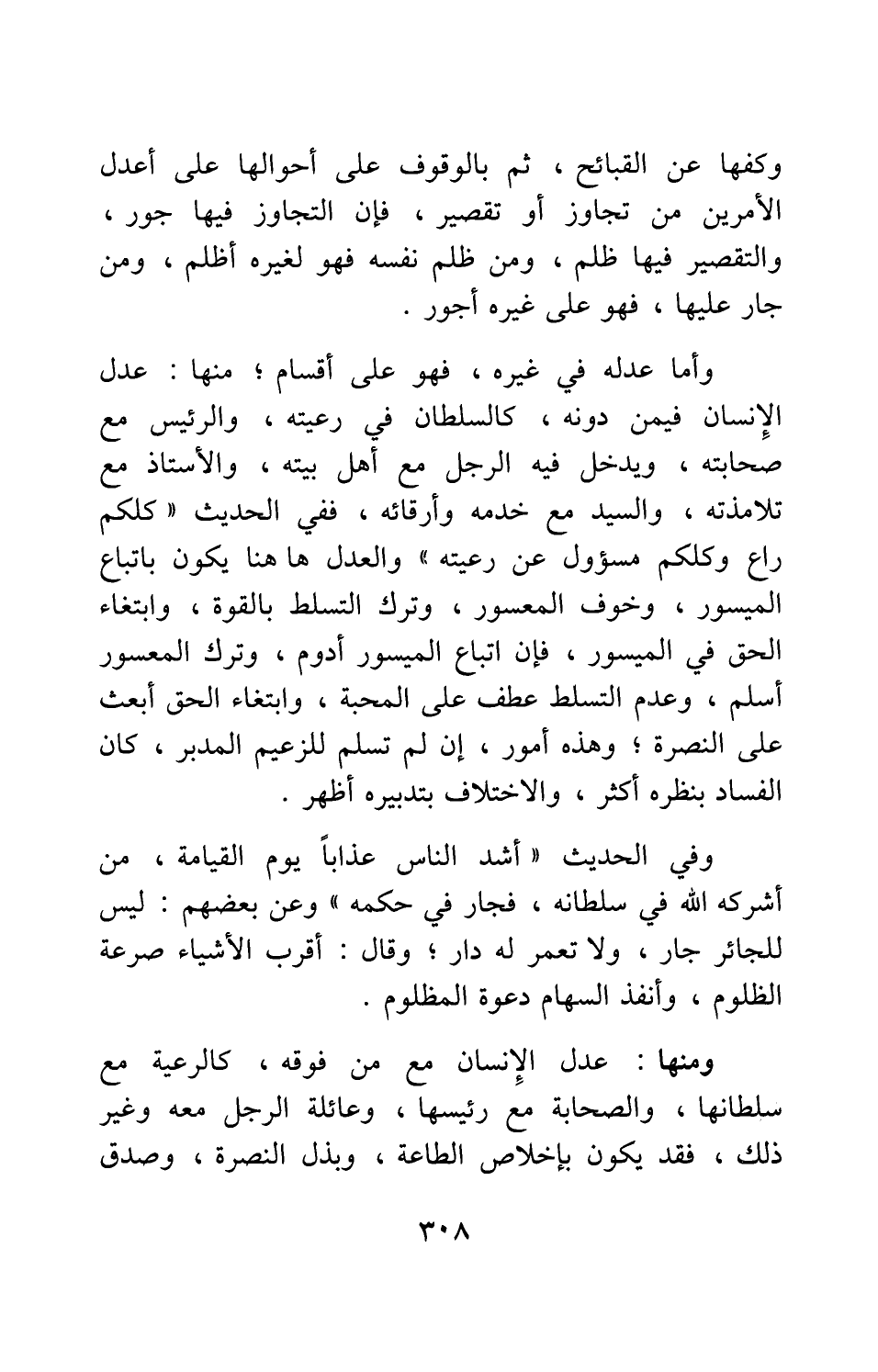 وأما عدله في غيره، فهو على أقسام منها: عدل الإنسان فيمن دونه، كالسلطان في رعيته، والرئيس مع صحابته، ويدخل فيه الرجل مع أهل بيته، والأستاذ مع تلامذته، والسيد مع خدمه وأرقائه، ففي الحديث " كلكم راع، وكلكم مسؤول عن رعيته " والعدل هاهنا يكون باتباع الميسور، وخوف المعسور، وترك التسلط بالقوة، وابتغاء الحق في الميسور، فإن اتباع الميسور أدوم، وترك المعسور أسلم، وعدم التسلط عطف على المحبة، وابتغاء الحق أبعث على النصرة، وهذه أمور إن لم تسلم للزعيم المدبر، كان الفساد بنظره أكثر، والاختلاف بتدبيره أظهر.