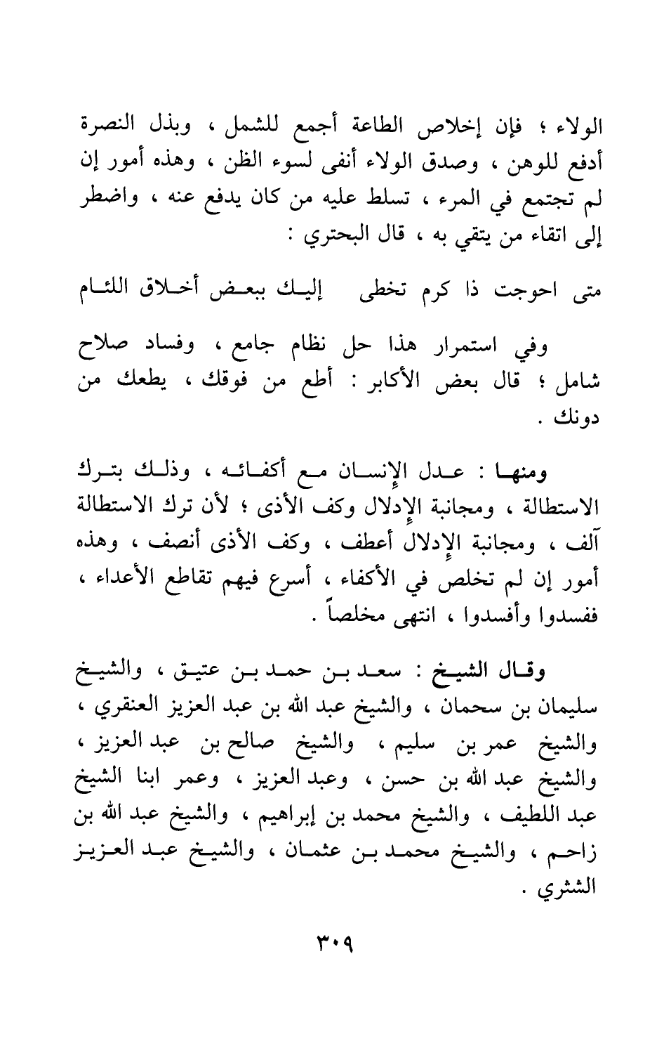 وقال الشيخ سعد بن حمد بن عتيق، والشيخ سليمان بن سحمان، والشيخ عبد الله بن عبد العزيز العنقري، والشيخ عمر بن سليم، والشيخ صالح بن عبد العزيز، والشيخ عبد الله بن حسن، وعبد العزيز، وعمر ابنا الشيخ عبد اللطيف، والشيخ محمد بن إبراهيم، والشيخ عبد الله بن زاحم، والشيخ محمد بن عثمان، والشيخ عبد العزيز الشثري.