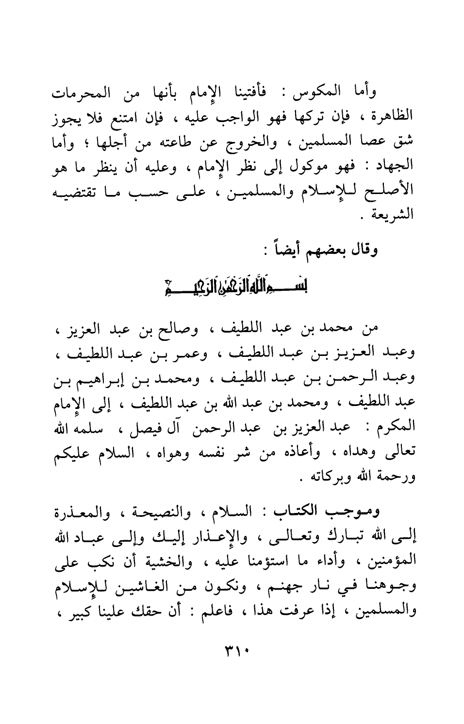 من محمد بن عبد اللطيف، وصالح بن عبد العزيز، وعبد العزيز بن عبد اللطيف، وعمر بن عبد اللطيف، وعبد الرحمن بن عبد اللطيف، ومحمد بن إبراهيم بن عبد اللطيف، ومحمد بن عبد الله بن عبد اللطيف، إلى الإمام المكرم: عبد العزيز بن عبد الرحمن آل فيصل، سلمه الله تعالى وهداه، وأعاذه من شر نفسه وهواه، السلام عليكم ورحمة الله وبركاته.