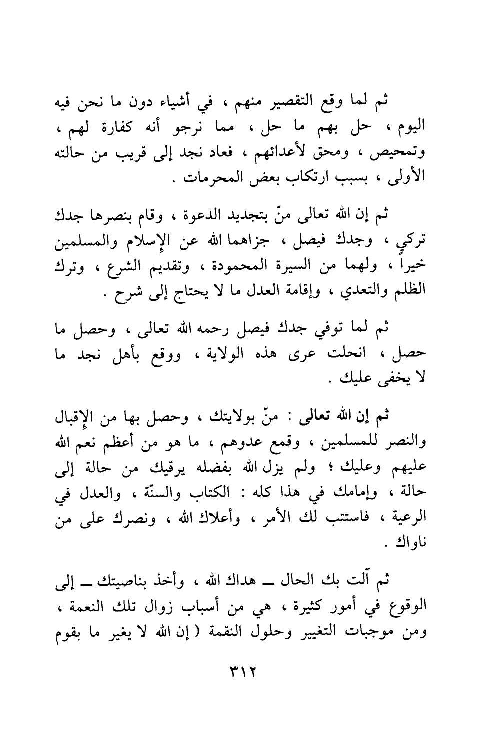 ثم إن الله تعالى من بتجديد الدعوة، وقام بنصرها جدك تركي، وجدك فيصل، جزاهما الله عن الإسلام والمسلمين خيرا؛ ولهما من السيرة المحمودة، وتقديم الشرع، وترك الظلم والتعدي، وإقامة العدل ما لا يحتاج إلى شرح.