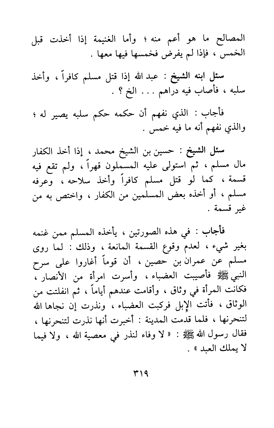 سئل ابنه الشيخ عبد الله: إذا قتل مسلم كافرا، وأخذ سلبه، فأصاب فيه دراهم.. إلخ؟. فأجاب: الذي نفهم أن حكمه حكم سلبه يصير له؛ والذي نفهم أنه ما فيه خمس.
