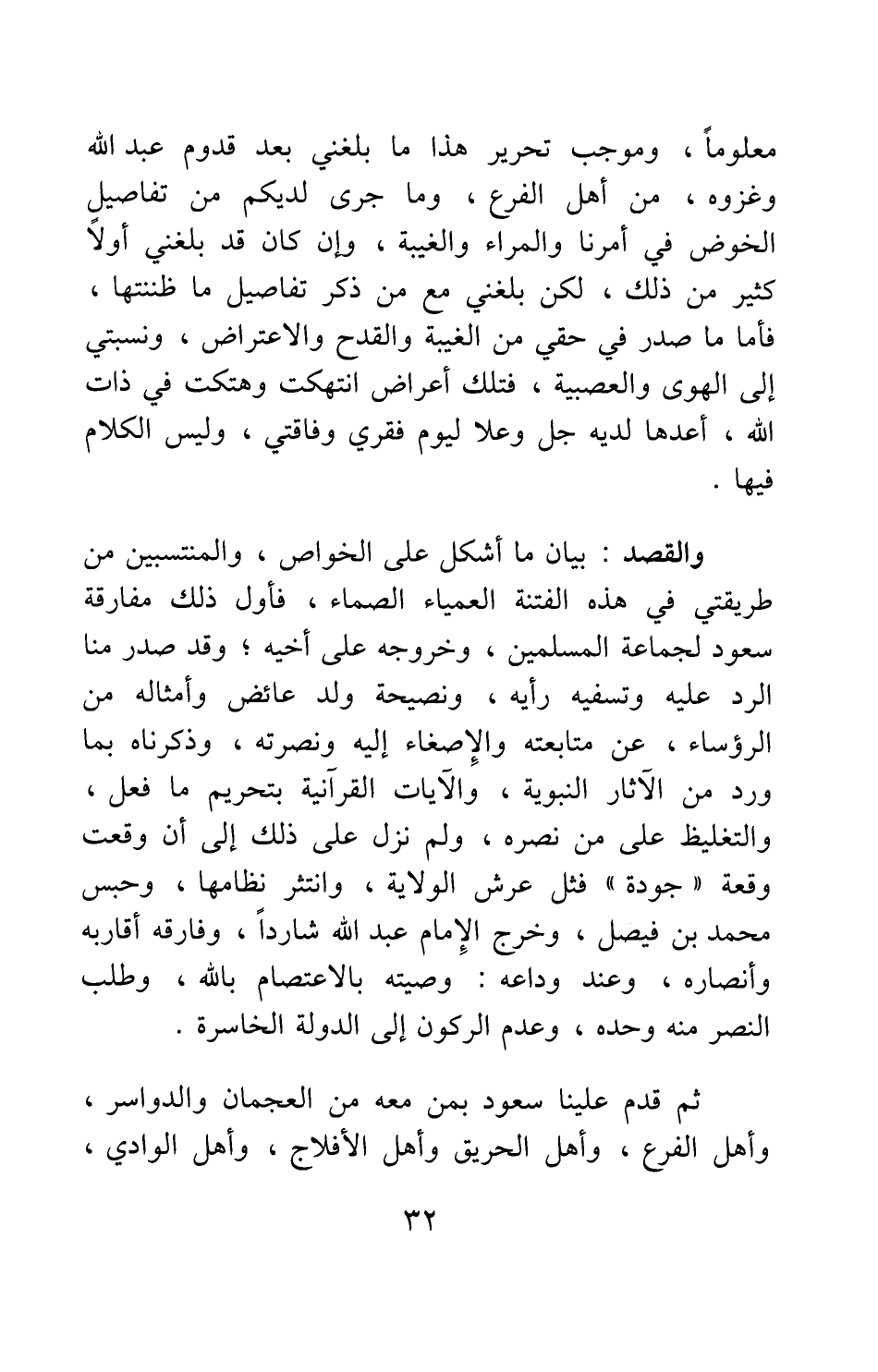 معلوما، وموجب تحرير هذا ما بلغني بعد قدوم عبد الله وغزوه، من أهل الفرع، وما جرى لديكم من تفاصيل الخوض في أمرنا والمراء والغيبة، وإن كان قد بلغني أولا كثير من ذلك، لكن بلغني مع من ذكر تفاصيل ما ظننتها، فأما ما صدر في حقي من الغيبة والقدح والاعتراض، ونسبتي إلى الهوى والعصبية، فتلك أعراض انتهكت وهتكت في ذات الله، أعدها لديه جل وعلا ليوم فقري وفاقتي، وليس الكلام فيها.