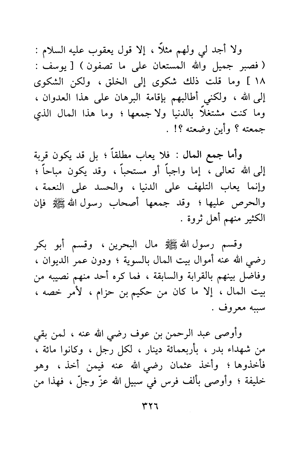 ولا أجد لي ولهم مثلا، إلا قول يعقوب عليه السلام {فَصَبْرٌ جَمِيلٌ وَاللَّهُ الْمُسْتَعَانُ عَلَى مَا تَصِفُونَ} [سورة يوسف آية: 18] وما قلت ذلك شكوى إلى الخلق، ولكن الشكوى إلى الله، ولكني أطالبهم بإقامة البرهان على هذا العدوان، وما كنت مشتغلا بالدنيا ولا جمعها وما هذا المال الذي جمعته؟ وأين وضعته؟!
