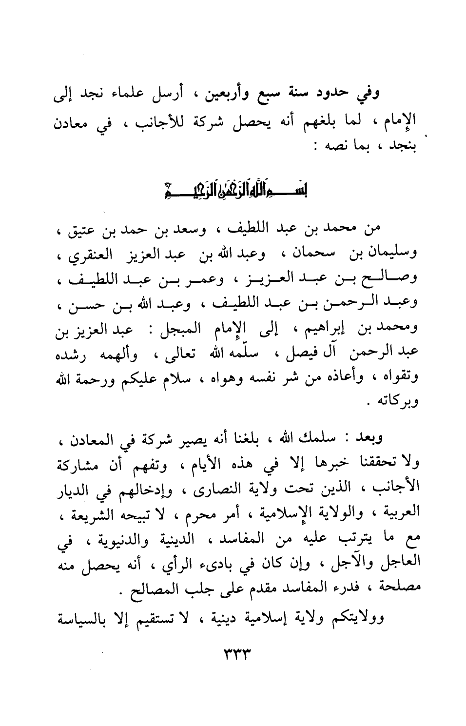 وبعد: سلمك الله، بلغنا أنه يصير شركة في المعادن، ولا تحققنا خبرها إلا في هذه الأيام، وتفهم أن مشاركة الأجانب الذين تحت ولاية النصارى وإدخالهم في الديار العربية، والولاية الإسلامية، أمر محرم، لا تبيحه الشريعة، مع ما يترتب عليه من المفاسد، الدينية والدنيوية، في العاجل والآجل، وإن كان في بادئ الرأي، أنه يحصل منه مصلحة، فدرء المفاسد مقدم على جلب المصالح.