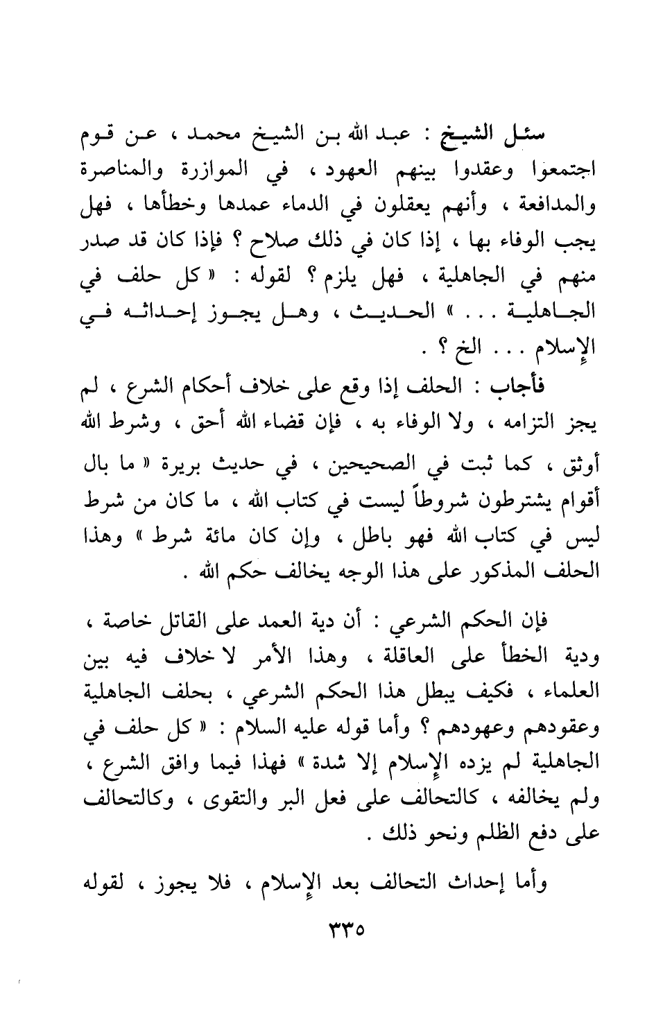 سئل الشيخ عبد الله بن الشيخ محمد، عن قوم اجتمعوا وعقدوا بينهم العهود، في الموازرة والمناصرة والمدافعة، وأنهم يعقلون في الدماء عمدها وخطأها، فهل يجب الوفاء بها، إذا كان في ذلك صلاح؟ فإذا كان قد صدر منهم في الجاهلية، فهل يلزم؟ لقوله: " كل حلف في الجاهلية.." الحديث، وهل يجوز إحداثه في الإسلام.. إلخ؟.