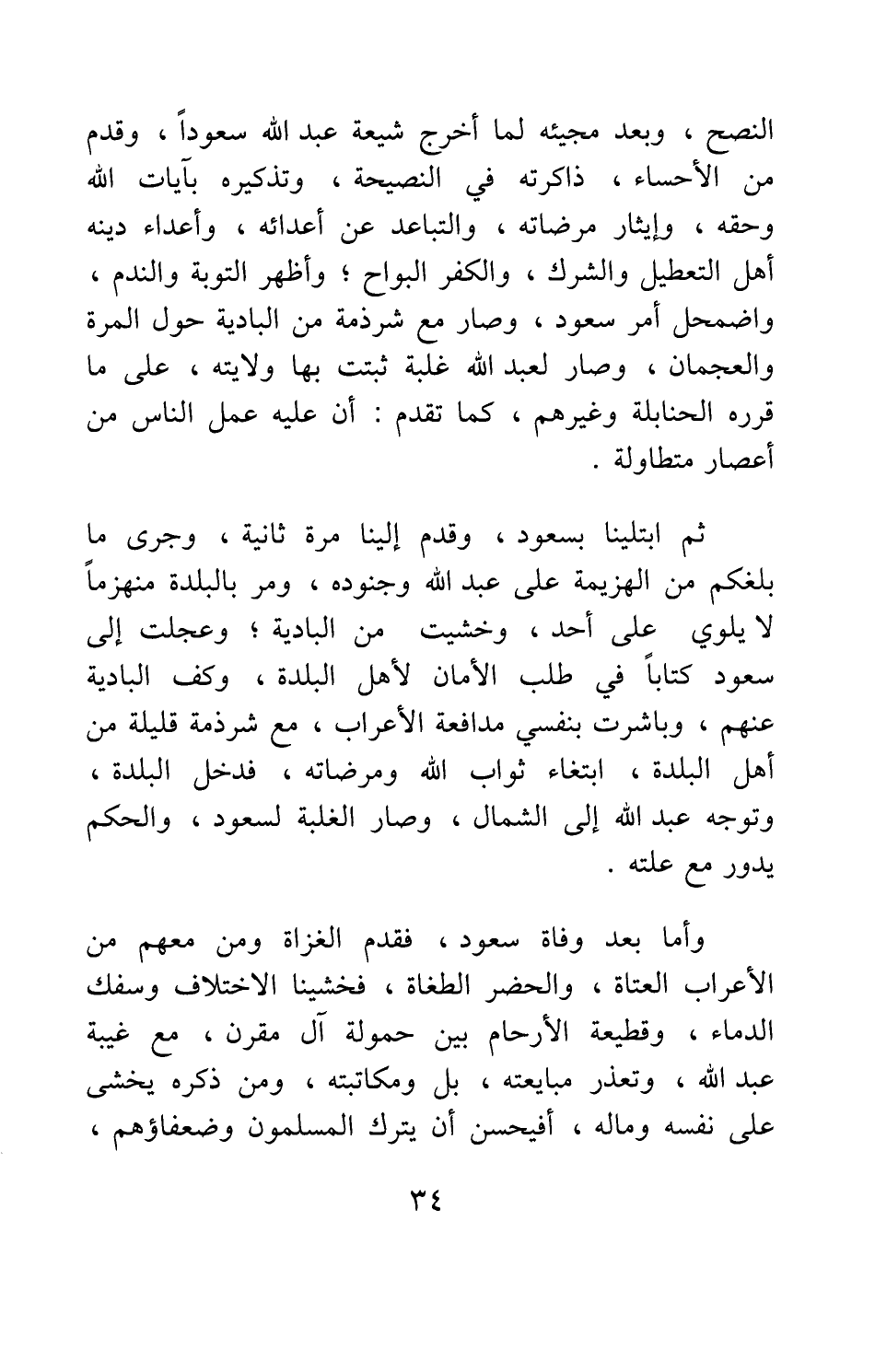 ثم ابتلينا بسعود، وقدم إلينا مرة ثانية، وجرى ما بلغكم من الهزيمة على عبد الله وجنوده، ومر بالبلدة منهزما لايلوي على أحد، وخشيت من البادية؛ وعجلت إلى سعود كتابا في طلب الأمان لأهل البلدة، وكف البادية عنهم، وباشرت بنفسي مدافعة الأعراب، مع شرذمة قليلة من أهل البلدة، ابتغاء ثواب الله ومرضاته، فدخل البلدة، وتوجه عبد الله إلى الشمال، وصار الغلبة لسعود، والحكم يدور مع علته.