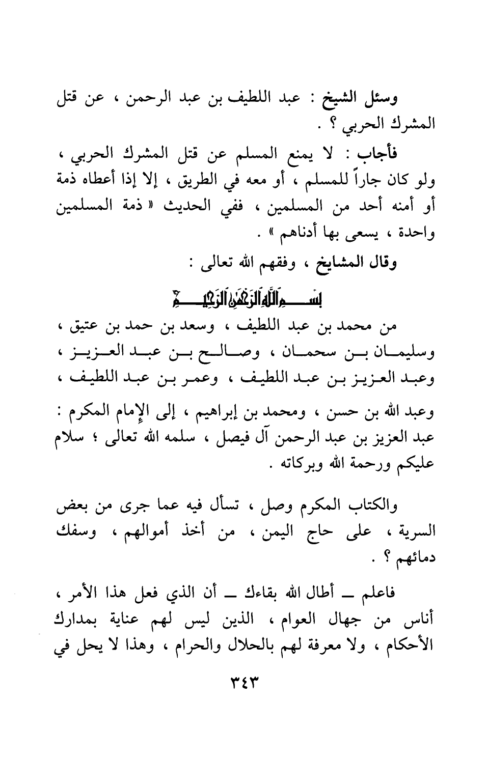 والكتاب المكرم وصل، تسأل فيه عما جرى من بعض السرية، على حاج اليمن، من أخذ أموالهم، وسفك دمائهم؟ فاعلم - أطال الله بقاءك - أن الذي فعل هذا الأمر، أناس من جهال العوام، الذين ليس لهم عناية بمدارك الأحكام، ولا معرفة لهم بالحلال والحرام، وهذا لا يحل في