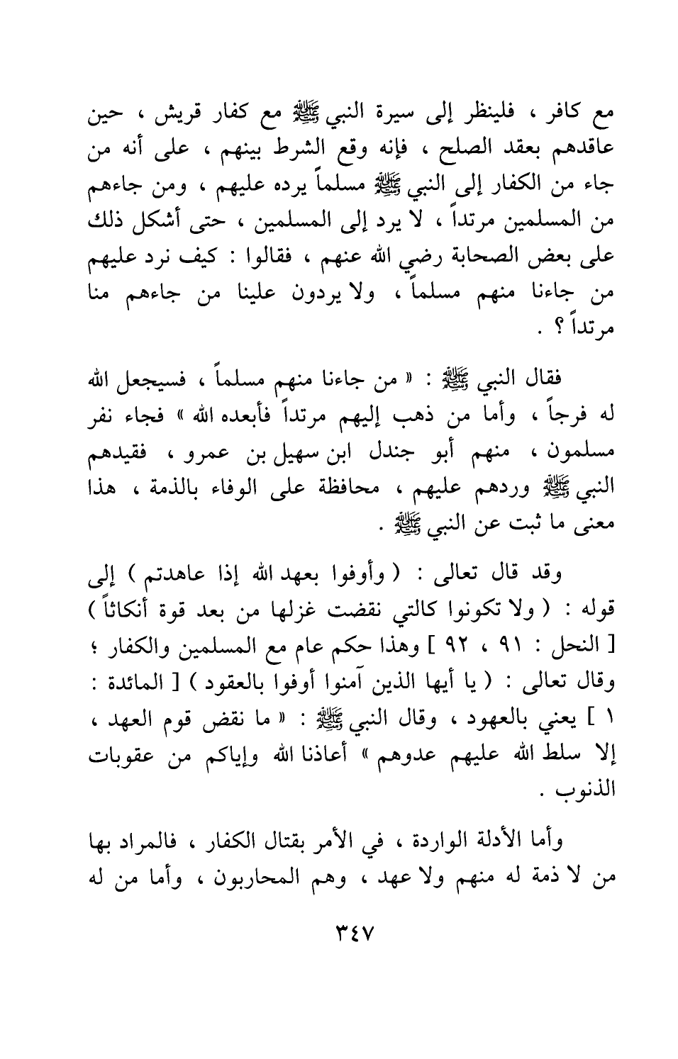 مع كافر، فلينظر إلى سيرة النبي صلى الله عليه وسلم مع كفار قريش، حين عاقدهم بعقد الصلح، فإنه وقع الشرط بينهم على أنه من جاء من الكفار إلى النبي صلى الله عليه وسلم مسلما يرده عليهم، ومن جاءهم من المسلمين مرتدا، لا يرد إلى المسلمين، حتى أشكل ذلك على بعض الصحابة رضي الله عنهم، فقالوا: كيف نرد عليهم من جاءنا منهم مسلما، ولا يردون علينا من جاءهم منا مرتدا؟ فقال النبي صلى الله عليه وسلم: " من جاءنا منهم مسلما، فسيجعل الله له فرجا، وأما من ذهب إليهم مرتدا فأبعده الله "، فجاء نفر مسلمون، منهم أبو جندل ابن سهيل بن عمرو، فقيدهم النبي صلى الله عليه وسلم وردهم عليهم، محافظة على الوفاء بالذمة، هذا معنى ما ثبت عن النبي صلى الله عليه وسلم.