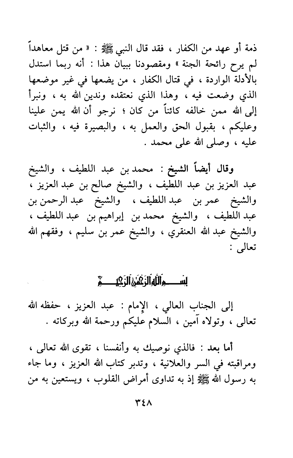 وقال أيضا الشيخ محمد بن عبد اللطيف، والشيخ عبد العزيز بن عبد اللطيف، والشيخ صالح بن عبد العزيز، والشيخ عمر بن عبد اللطيف، والشيخ عبد الرحمن بن عبد اللطيف، والشيخ محمد بن إبراهيم بن عبد اللطيف، والشيخ عبد الله العنقري، والشيخ عمر بن سليم، وفقهم الله تعالى: