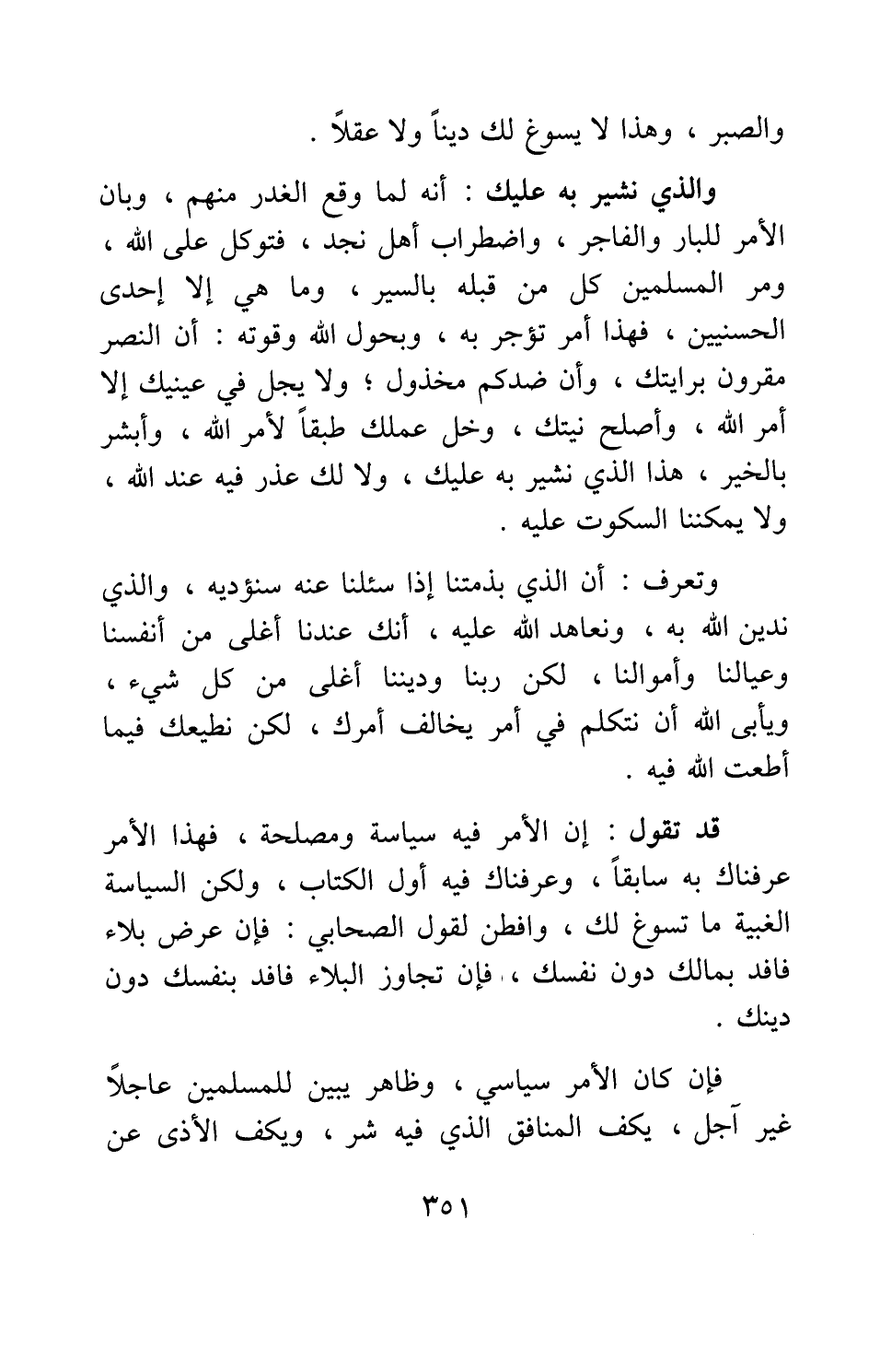 والذي نشير به عليك: أنه لما وقع الغدر منهم، وبان الأمر للبار والفاجر، واضطراب أهل نجد، فتوكل على الله، ومر المسلمين كل من قبله بالسير، وما هي إلا إحدى الحسنيين، فهذا أمر تؤجر به؛ وبحول الله وقوته أن النصر مقرون برايتك، وأن ضدكم مخذول ; ولا يجل في عينيك إلا أمر الله، وأصلح نيتك، وخل عملك طبقا لأمر الله، وأبشر بالخير؛ هذا الذي نشير به عليك، ولا لك عذر فيه عند الله، ولا يمكننا السكوت عليه.