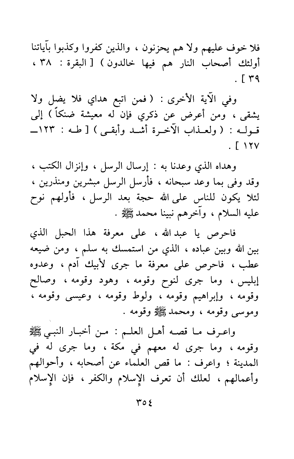 وهداه الذي وعدنا به: إرسال الرسل، وإنزال الكتب، وقد وفى بما وعد سبحانه؛ فأرسل الرسل مبشرين ومنذرين، لئلا يكون للناس على الله حجة بعد الرسل؛ فأولهم نوح عليه السلام، وآخرهم نبينا محمد صلى الله عليه وسلم. فاحرص يا عبد الله، على معرفة هذا الحبل الذي بين الله وبين عباده، الذي من استمسك به سلم، ومن ضيعه عطب. فاحرص على معرفة ما جرى لأبيك آدم، وعدوه إبليس، وما جرى لنوح وقومه، وهود وقومه، وصالح وقومه، وإبراهيم وقومه، ولوط وقومه، وعيسى وقومه، وموسى وقومه، ومحمد صلى الله عليه وسلم وقومه.