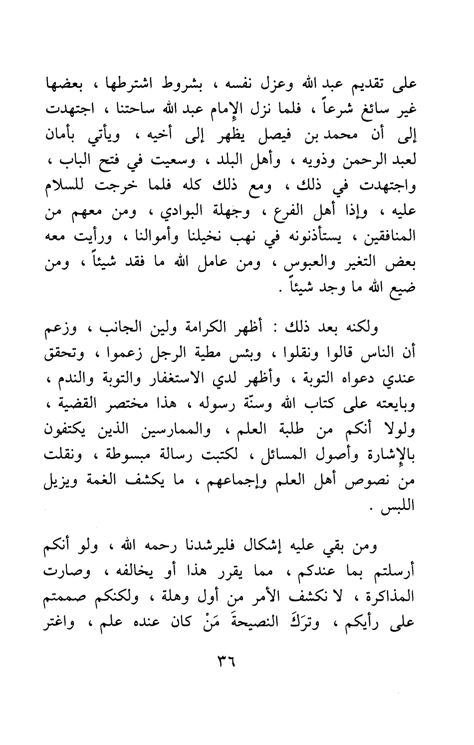 على تقديم عبد الله وعزل نفسه، بشروط اشترطها، بعضها غير سائغ شرعا، فلما نزل الإمام عبد الله ساحتنا، اجتهدت إلى أن محمد بن فيصل يظهر إلى أخيه، ويأتي بأمان لعبد الرحمن وذويه، وأهل البلد، وسعيت في فتح الباب، واجتهدت في ذلك، ومع ذلك كله فلما خرجت للسلام عليه، وإذا أهل الفرع، وجهلة البوادي، ومن معهم من المنافقين، يستأذنونه في نهب نخيلنا وأموالنا، ورأيت معه بعض التغير والعبوس، ومن عامل الله ما فقد شيئا، ومن ضيع الله ما وجد شيئا.
