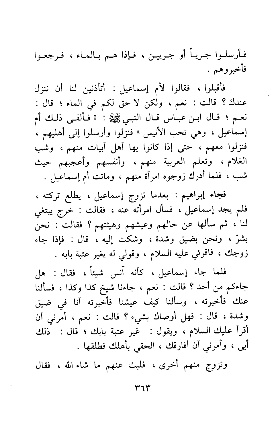 فأرسلوا جريا أو جريين، فإذا هم بالماء، فرجعوا فأخبروهم. فأقبلوا، فقالوا لأم إسماعيل: أتأذنين لنا أن ننْزل عندك؟ قالت: نعم، ولكن لا حق لكم في الماء ; قال: نعم ; قال ابن عباس: قال النبي صلى الله عليه وسلم: فألفى ذلك أم إسماعيل، وهي تحب الأنيس. فنزلوا وأرسلوا إلى أهليهم، فنْزلوا معهم، حتى إذا كانوا بها أهل أبيات منهم، وشب الغلام، وتعلم العربية منهم، وأنفسهم وأعجبهم حيث شب؛ فلما أدرك زوجوه امرأة منهم، وماتت أم إسماعيل. فجاء إبراهيم: بعدما تزوج إسماعيل، يطلع تركته، فلم يجد إسماعيل، فسأل امرأته عنه، فقالت: خرج يبتغي لنا. ثم سألها عن حالهم وعيشهم وهيئتهم؟ فقالت: نحن بشر، ونحن بضيق وشدة، وشكت إليه، قال: فإذا جاء زوجك، فاقرئي عليه السلام، وقولي له يغير عتبة بابه. فلما جاء إسماعيل، كأنه أنس شيئا، فقال: هل جاءكم من أحد؟ قالت: نعم، جاءنا شيخ كذا وكذا، فسألنا عنك فأخبرته، وسألنا كيف عيشنا فأخبرته أنا في ضيق وشدة، قال: فهل أوصاك بشيء؟ قالت: نعم، أمرني أن أقرأ عليك السلام، ويقول: غير عتبة بابك ; قال: ذلك أبي، وأمرني أن أفارقك، الحقي بأهلك فطلقها.