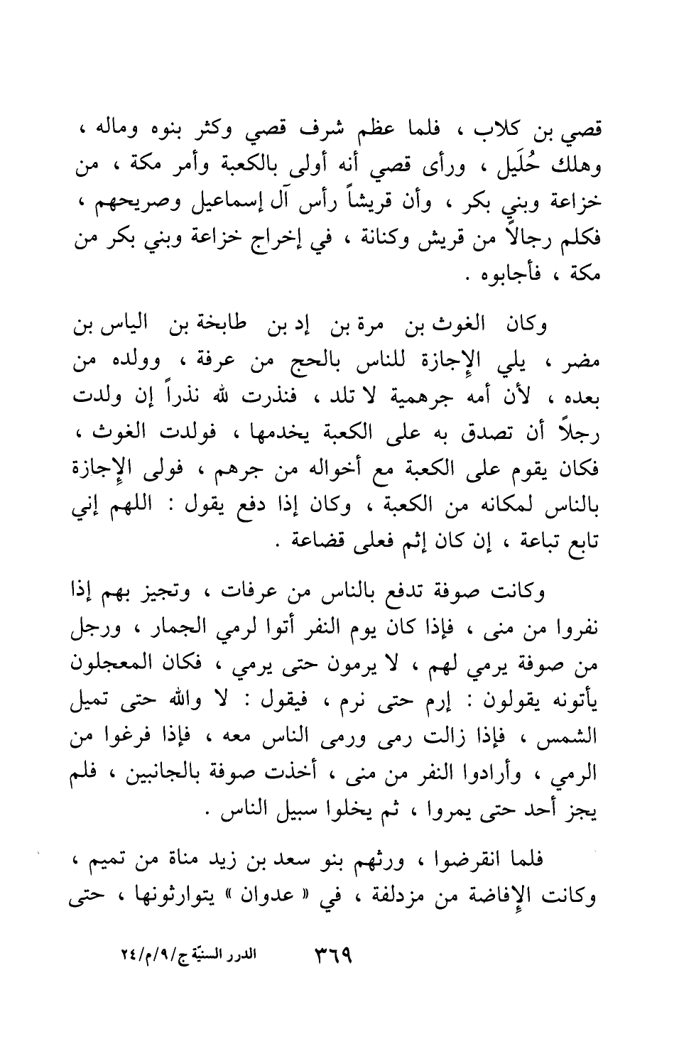 قصي بن كلاب. فلما عظم شرف قصي وكثر بنوه وماله، وهلك خليل، ورأى قصي أنه أولى بالكعبة وأمر مكة، من خزاعة وبني بكر، وأن قريشا رأس آل إسماعيل وصريحهم، فكلم رجالا من قريش وكنانة، في إخراج خزاعة وبني بكر من مكة، فأجابوه. وكان الغوث بن مرة بن إد بن طابخة بن إلياس بن مضر، يلي الإجازة للناس بالحج من عرفة، وولده من بعده، لأن أمه جرهمية لا تلد، فنذرت لله نذرا إن ولدت رجلا أن تصدق به على الكعبة يخدمها، فولدت الغوث، فكان يقوم على الكعبة مع أخواله من جرهم، فولي الإجازة بالناس لمكانه من الكعبة، وكان إذا دفع يقول: