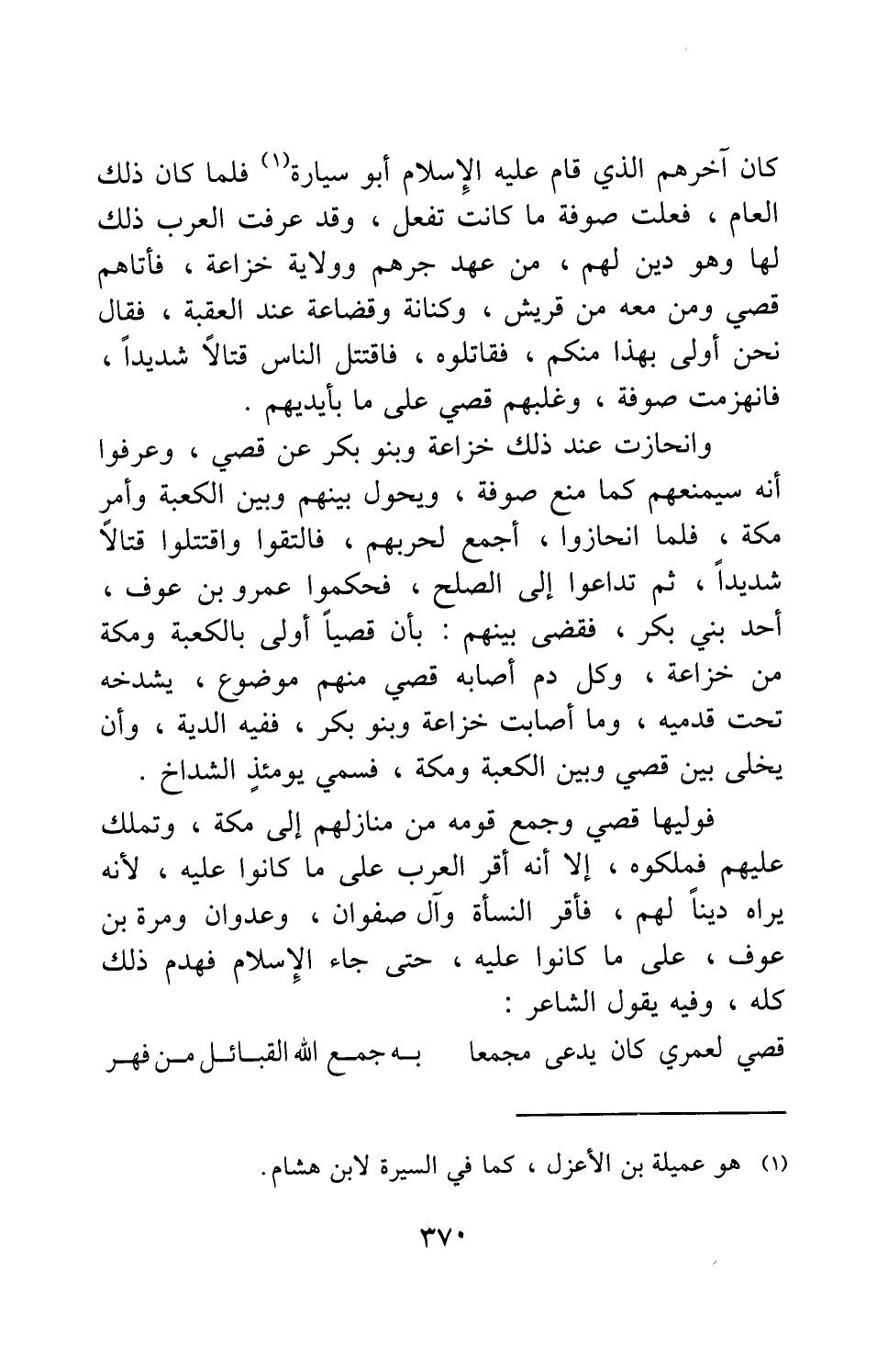 كان آخرهم الذي قام عليه الإسلام أبو سيارة 1 فلما كان ذلك العام، فعلت صوفة ما كانت تفعل، وقد عرفت العرب ذلك لها وهو دين لهم، من عهد جرهم وولاية خزاعة، فأتاهم قصي ومن معه من قريش، وكنانة وقضاعة عند العقبة، فقال: نحن أولى بهذا منكم، فقاتلوه؛ فاقتتل الناس قتالا شديدا، فانهزمت صوفة، وغلبهم قصي على ما بأيديهم.