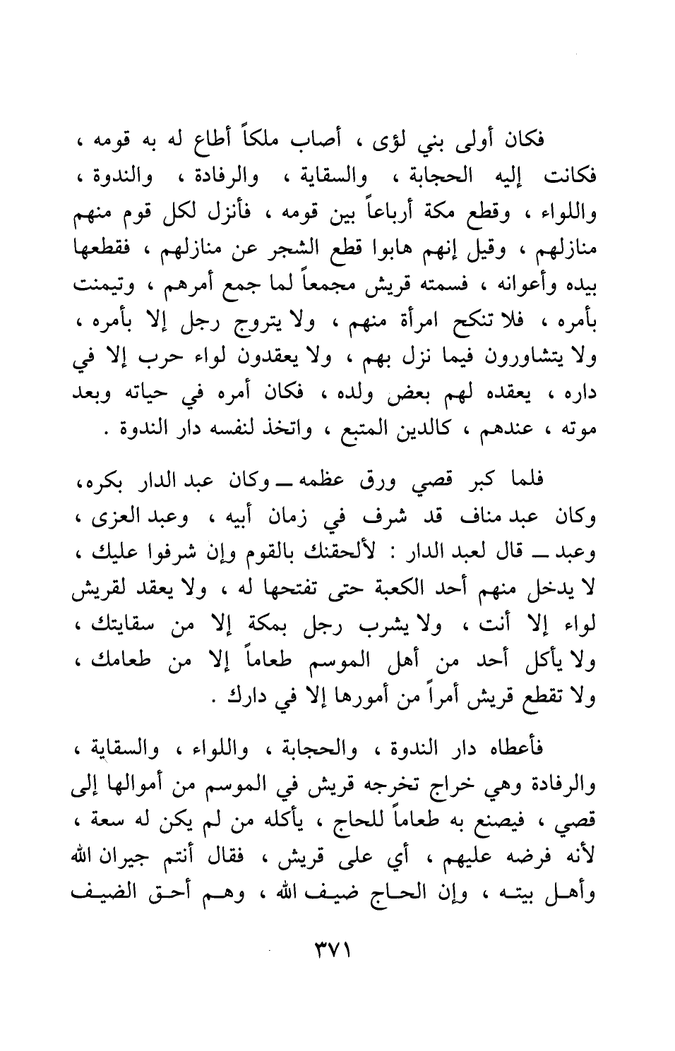 فلما كبر قصي ورق عظمه - وكان عبد الدار بكره، وكان عبد مناف قد شرف في زمان أبيه، وعبد العزى، وعبد - قال لعبد الدار: لألحقنك بالقوم وإن شرفوا عليك، لا يدخل منهم أحد الكعبة حتى تفتحها له، ولا يعقد لقريش لواء إلا أنت، ولا يشرب رجل بمكة إلا من سقايتك، ولا يأكل أحد من أهل الموسم طعاما إلا من طعامك، ولا تقطع قريش أمرا من أمورها إلا في دارك.