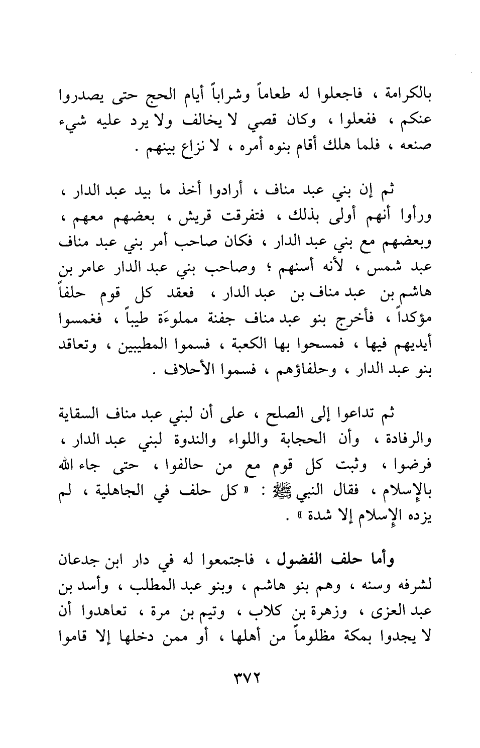 ثم تداعوا إلى الصلح، على أن لبني عبد مناف السقاية والرفادة، وأن الحجابة واللواء والندوة لبني عبد الدار؛ فرضوا، وثبت كل قوم مع من حالفوا، حتى جاء الله بالإسلام، فقال النبي صلى الله عليه وسلم: " كل حلف في الجاهلية، لم يزده الإسلام إلا شدة " 1.