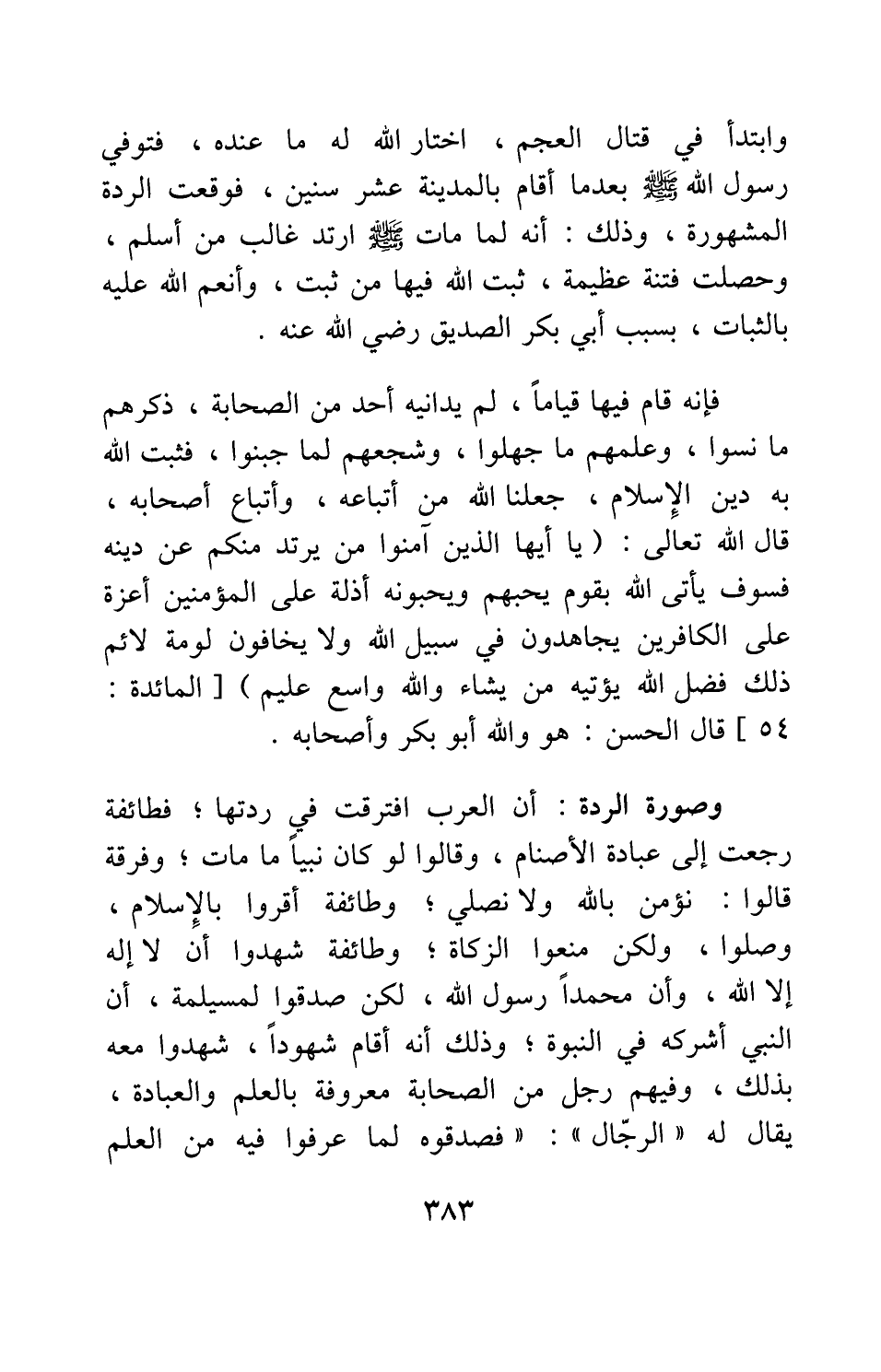 فإنه قام فيها قياما لم يدانه أحد من الصحابة، ذكرهم ما نسوا، وعلمهم ما جهلوا، وشجعهم لما جبنوا، فثبت الله به دين الإسلام، جعلنا الله من أتباعه، وأتباع أصحابه، قال الله تعالى: {يَا أَيُّهَا الَّذِينَ آمَنُوا مَنْ يَرْتَدَّ مِنْكُمْ عَنْ دِينِهِ فَسَوْفَ يَأْتِي اللَّهُ بِقَوْمٍ يُحِبُّهُمْ وَيُحِبُّونَهُ أَذِلَّةٍ عَلَى الْمُؤْمِنِينَ أَعِزَّةٍ عَلَى الْكَافِرِينَ يُجَاهِدُونَ فِي سَبِيلِ اللَّهِ وَلا يَخَافُونَ لَوْمَةَ لائِمٍ ذَلِكَ فَضْلُ اللَّهِ يُؤْتِيهِ مَنْ يَشَاءُ وَاللَّهُ وَاسِعٌ عَلِيمٌ} [سورة المائدة آية: 54] قال الحسن: هو والله أبو بكر وأصحابه.